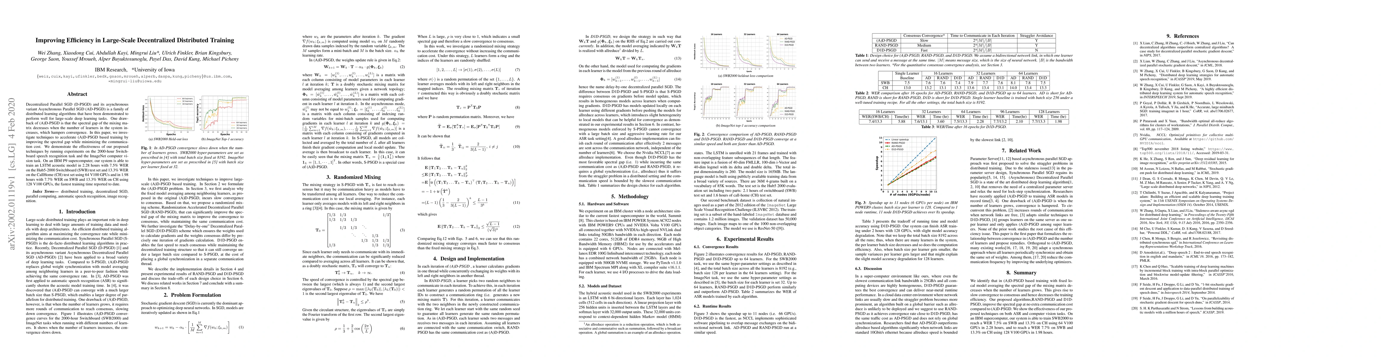 This paper proposes techniques to enhance the efficiency of decentralized distributed training algorithms like D-PSGD and Asynchronous D-PSGD, focusing on improving the spectral gap to accelerate convergence while minimizing communication costs. Experiments on large-scale tasks show significant improvements in training speed, achieving the fastest reported times on the Switchboard and ImageNet datasets.