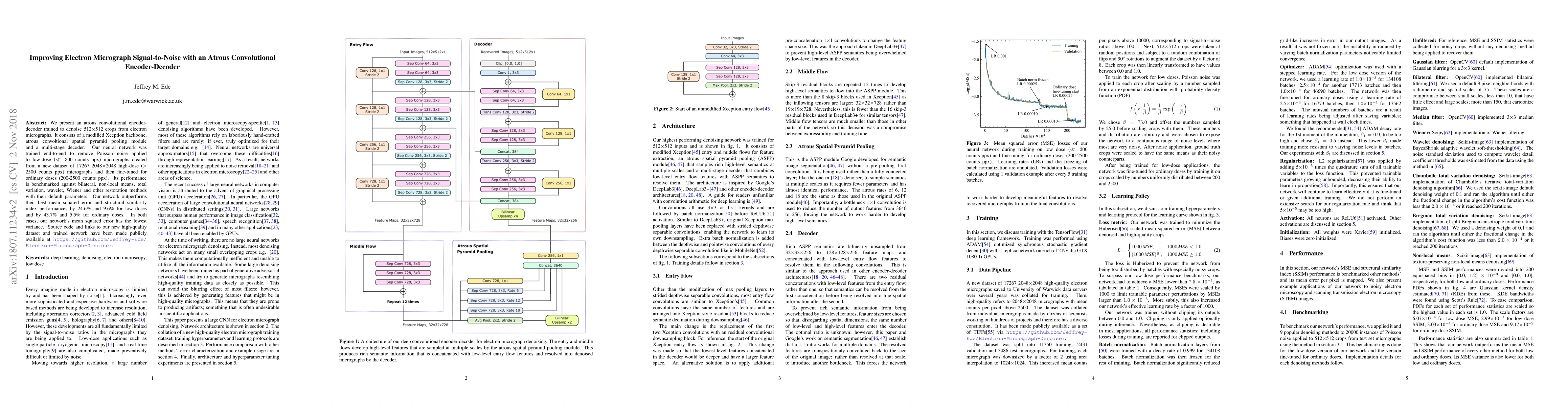 We present an atrous convolutional encoder-decoder trained to denoise 512$\times$512 crops from electron micrographs. It consists of a modified Xception backbone, atrous convoltional spatial pyramid pooling module and a multi-stage decoder. Our neural network was trained end-to-end to remove Poisson noise applied to low-dose ($\ll$ 300 counts ppx) micrographs created from a new dataset of 17267 2048$\times$2048 high-dose ($>$ 2500 counts ppx) micrographs and then fine-tuned for ordinary doses (200-2500 counts ppx). Its performance is benchmarked against bilateral, non-local means, total variation, wavelet, Wiener and other restoration methods with their default parameters. Our network outperforms their best mean squared error and structural similarity index performances by 24.6% and 9.6% for low doses and by 43.7% and 5.5% for ordinary doses. In both cases, our network's mean squared error has the lowest variance. Source code and links to our new high-quality dataset and trained network have been made publicly available at https://github.com/Jeffrey-Ede/Electron-Micrograph-Denoiser