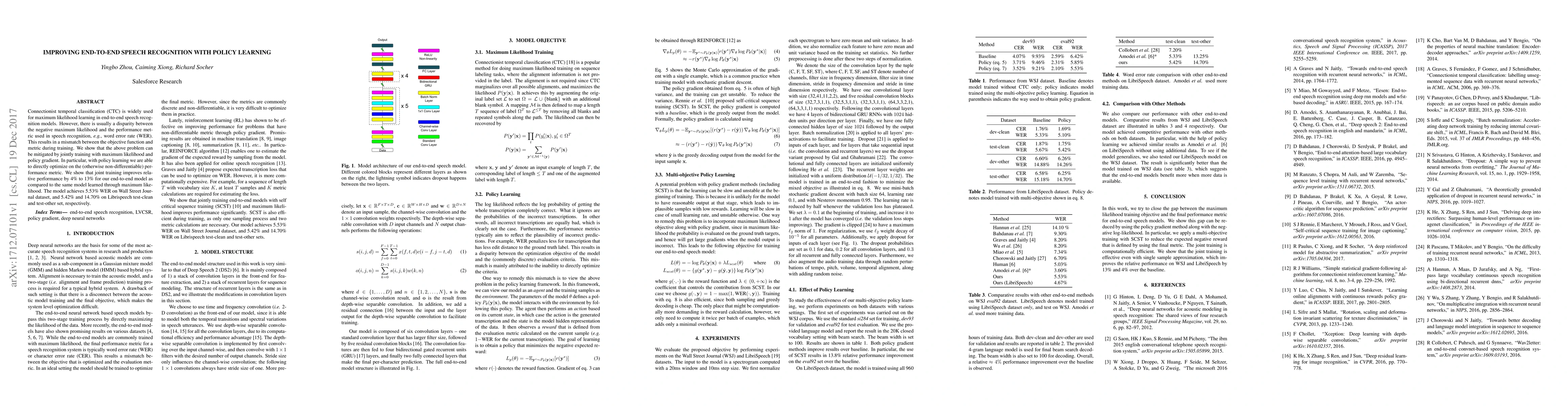 Connectionist temporal classification (CTC) is widely used for maximum likelihood learning in end-to-end speech recognition models. However, there is usually a disparity between the negative maximum likelihood and the performance metric used in speech recognition, e.g., word error rate (WER). This results in a mismatch between the objective function and metric during training. We show that the above problem can be mitigated by jointly training with maximum likelihood and policy gradient. In particular, with policy learning we are able to directly optimize on the (otherwise non-differentiable) performance metric. We show that joint training improves relative performance by 4% to 13% for our end-to-end model as compared to the same model learned through maximum likelihood. The model achieves 5.53% WER on Wall Street Journal dataset, and 5.42% and 14.70% on Librispeech test-clean and test-other set, respectively.