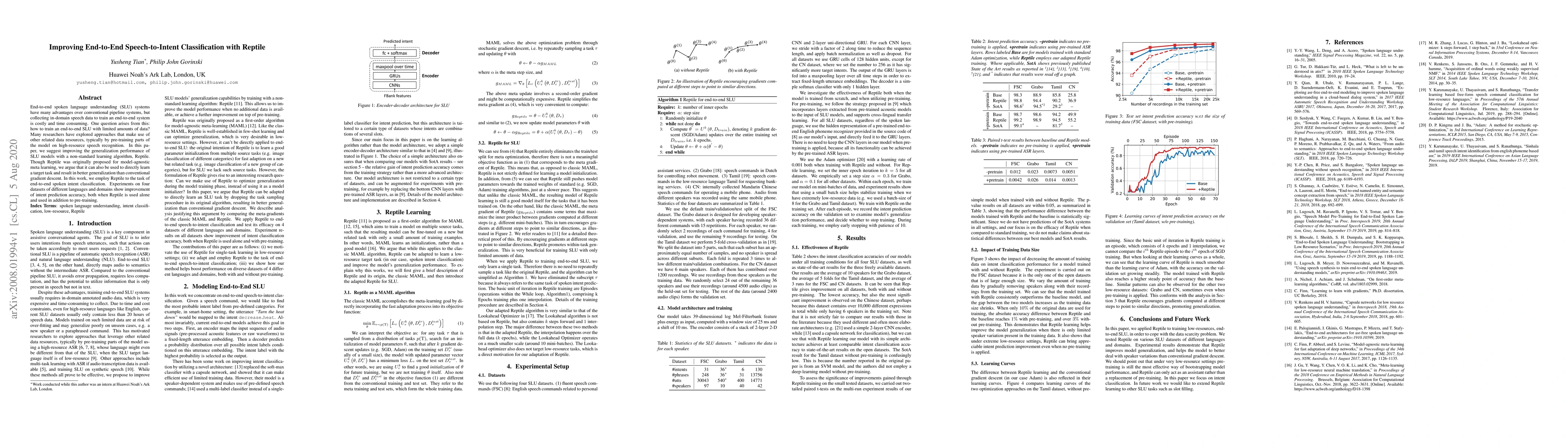End-to-end spoken language understanding (SLU) systems have many advantages over conventional pipeline systems, but collecting in-domain speech data to train an end-to-end system is costly and time consuming. One question arises from this: how to train an end-to-end SLU with limited amounts of data? Many researchers have explored approaches that make use of other related data resources, typically by pre-training parts of the model on high-resource speech recognition. In this paper, we suggest improving the generalization performance of SLU models with a non-standard learning algorithm, Reptile. Though Reptile was originally proposed for model-agnostic meta learning, we argue that it can also be used to directly learn a target task and result in better generalization than conventional gradient descent. In this work, we employ Reptile to the task of end-to-end spoken intent classification. Experiments on four datasets of different languages and domains show improvement of intent prediction accuracy, both when Reptile is used alone and used in addition to pre-training.