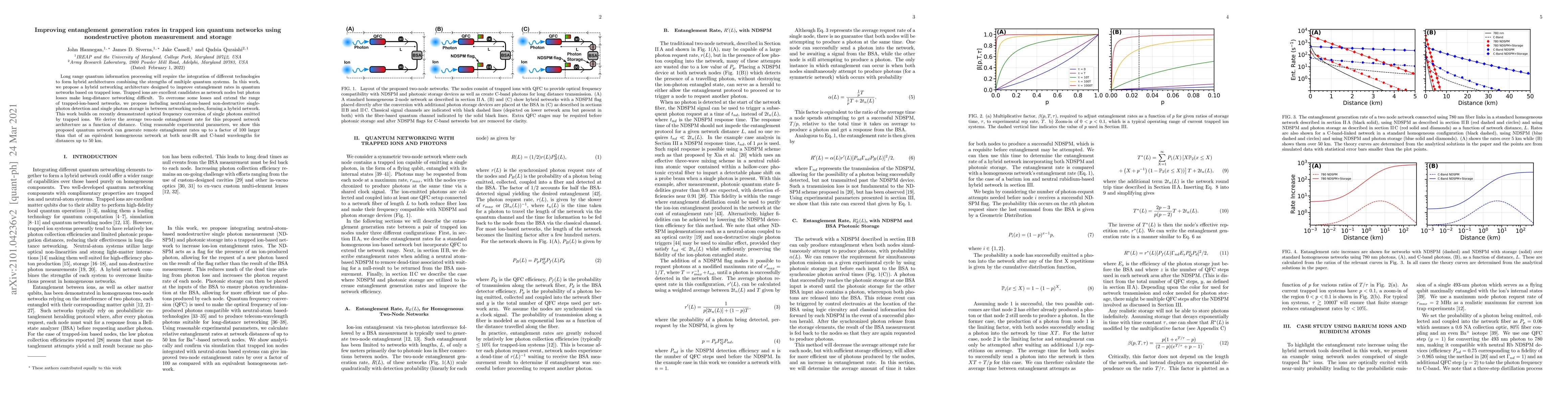 This paper proposes a hybrid quantum network architecture that combines trapped ion systems with neutral atom-based non-destructive photon detection and storage to enhance entanglement generation rates over long distances. The study demonstrates that this approach can achieve entanglement rates up to 100 times higher than conventional networks, extending the range up to 50 km.