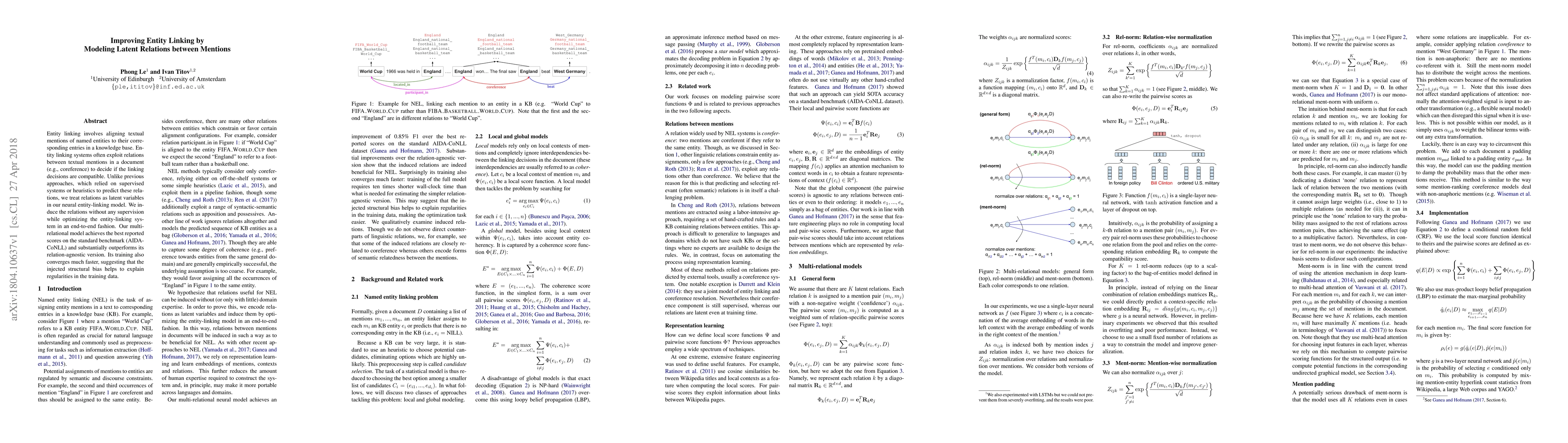 This paper proposes a neural entity-linking model that infers latent relations between textual mentions without supervision, achieving superior performance on the AIDA-CoNLL benchmark compared to its relation-agnostic counterpart, and demonstrating faster convergence during training.