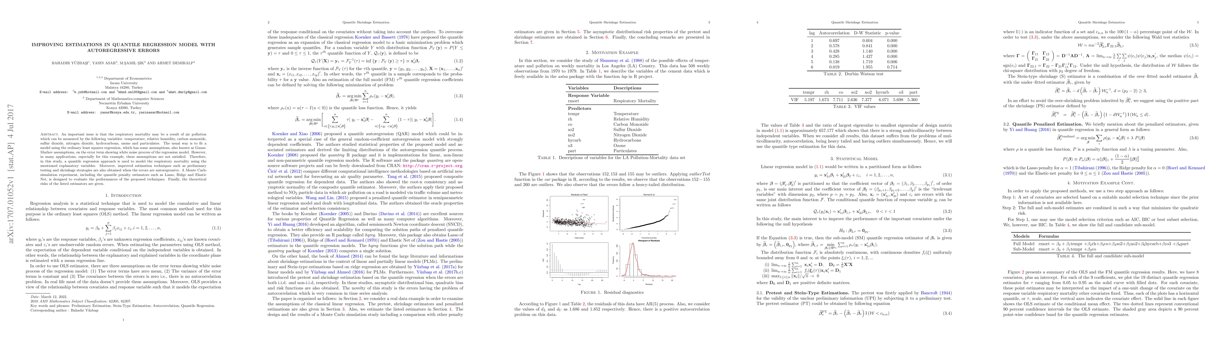 This paper proposes a quantile regression model for estimating respiratory mortality influenced by air pollutants, addressing non-white noise error terms through autoregressive errors. It introduces improved estimation techniques and evaluates their performance using Monte Carlo simulations and quantile penalty estimators.