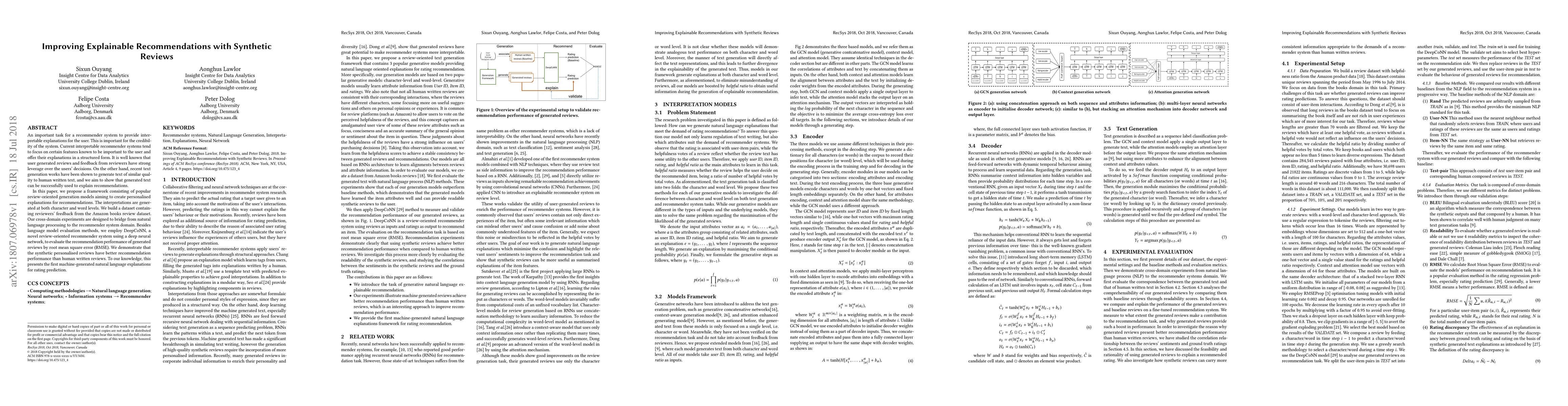 An important task for a recommender system to provide interpretable explanations for the user. This is important for the credibility of the system. Current interpretable recommender systems tend to focus on certain features known to be important to the user and offer their explanations in a structured form. It is well known that user generated reviews and feedback from reviewers have strong leverage over the users' decisions. On the other hand, recent text generation works have been shown to generate text of similar quality to human written text, and we aim to show that generated text can be successfully used to explain recommendations. In this paper, we propose a framework consisting of popular review-oriented generation models aiming to create personalised explanations for recommendations. The interpretations are generated at both character and word levels. We build a dataset containing reviewers' feedback from the Amazon books review dataset. Our cross-domain experiments are designed to bridge from natural language processing to the recommender system domain. Besides language model evaluation methods, we employ DeepCoNN, a novel review-oriented recommender system using a deep neural network, to evaluate the recommendation performance of generated reviews by root mean square error (RMSE). We demonstrate that the synthetic personalised reviews have better recommendation performance than human written reviews. To our knowledge, this presents the first machine-generated natural language explanations for rating prediction.