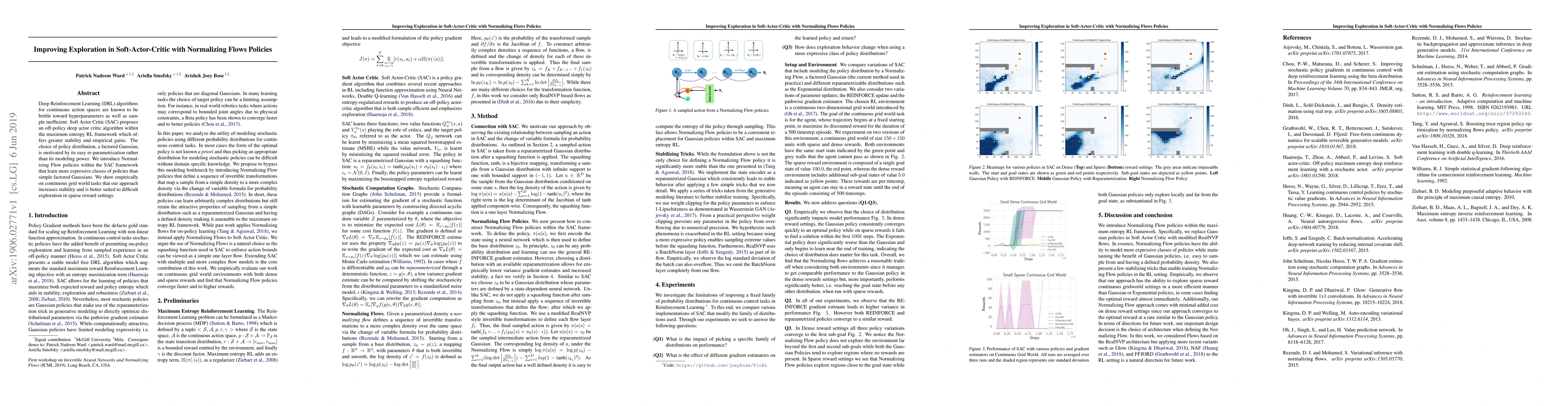 Deep Reinforcement Learning (DRL) algorithms for continuous action spaces are known to be brittle toward hyperparameters as well as \cut{being}sample inefficient. Soft Actor Critic (SAC) proposes an off-policy deep actor critic algorithm within the maximum entropy RL framework which offers greater stability and empirical gains. The choice of policy distribution, a factored Gaussian, is motivated by \cut{chosen due}its easy re-parametrization rather than its modeling power. We introduce Normalizing Flow policies within the SAC framework that learn more expressive classes of policies than simple factored Gaussians. \cut{We also present a series of stabilization tricks that enable effective training of these policies in the RL setting.}We show empirically on continuous grid world tasks that our approach increases stability and is better suited to difficult exploration in sparse reward settings.