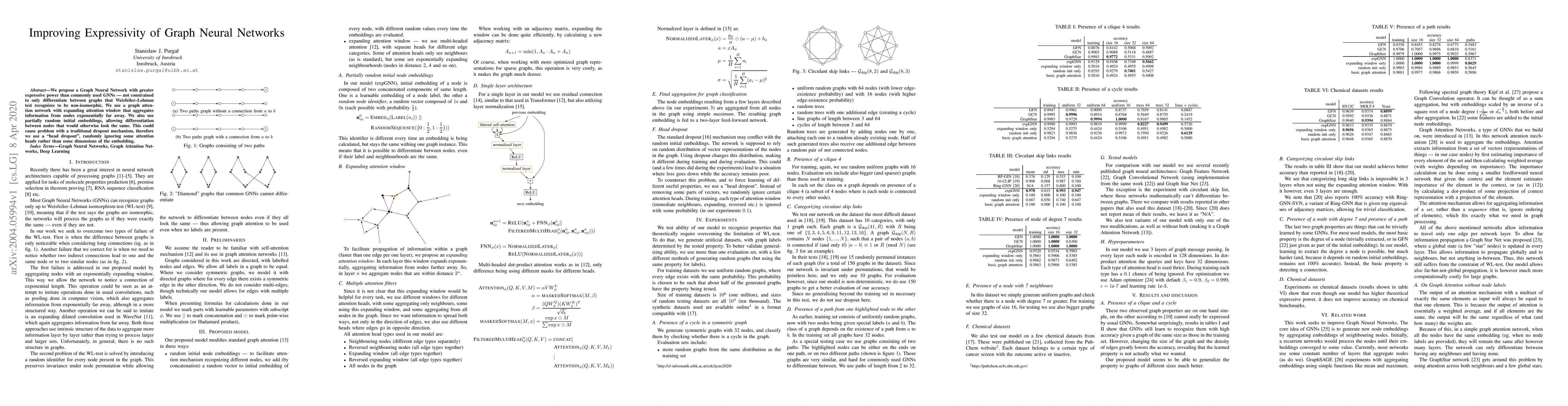 We propose a Graph Neural Network with greater expressive power than commonly used GNNs - not constrained to only differentiate between graphs that Weisfeiler-Lehman test recognizes to be non-isomorphic. We use a graph attention network with expanding attention window that aggregates information from nodes exponentially far away. We also use partially random initial embeddings, allowing differentiation between nodes that would otherwise look the same. This could cause problem with a traditional dropout mechanism, therefore we use a "head dropout", randomly ignoring some attention heads rather than some dimensions of the embedding.