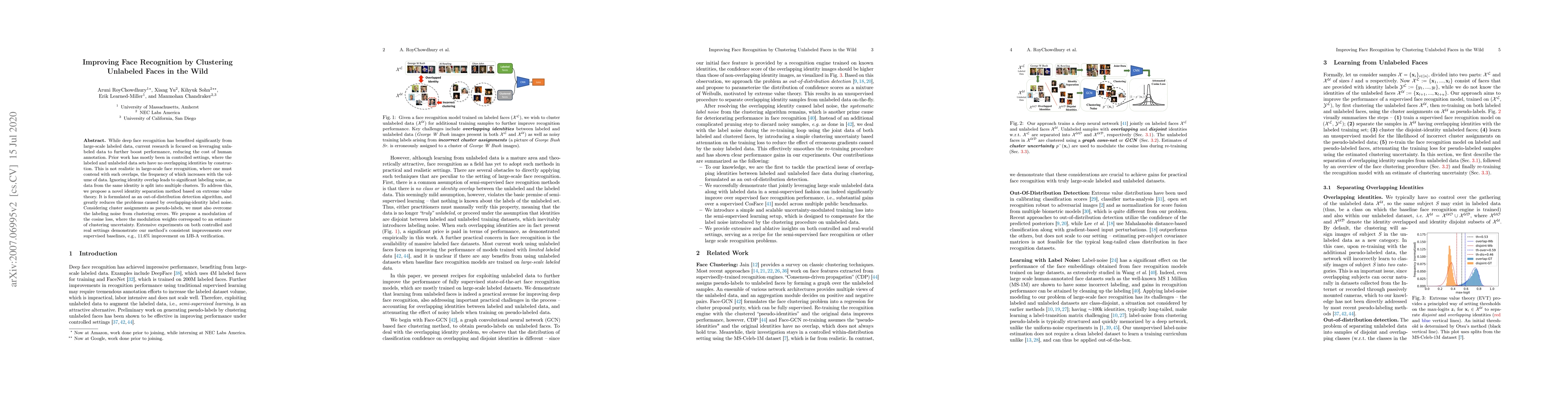 This paper proposes a novel identity separation method based on extreme value theory to address label noise from overlapping identities in unlabeled data for face recognition. It also introduces a modulation of the cosine loss to mitigate clustering uncertainty, demonstrating significant improvements over supervised baselines, such as a 11.6% boost in verification on IJB-A.