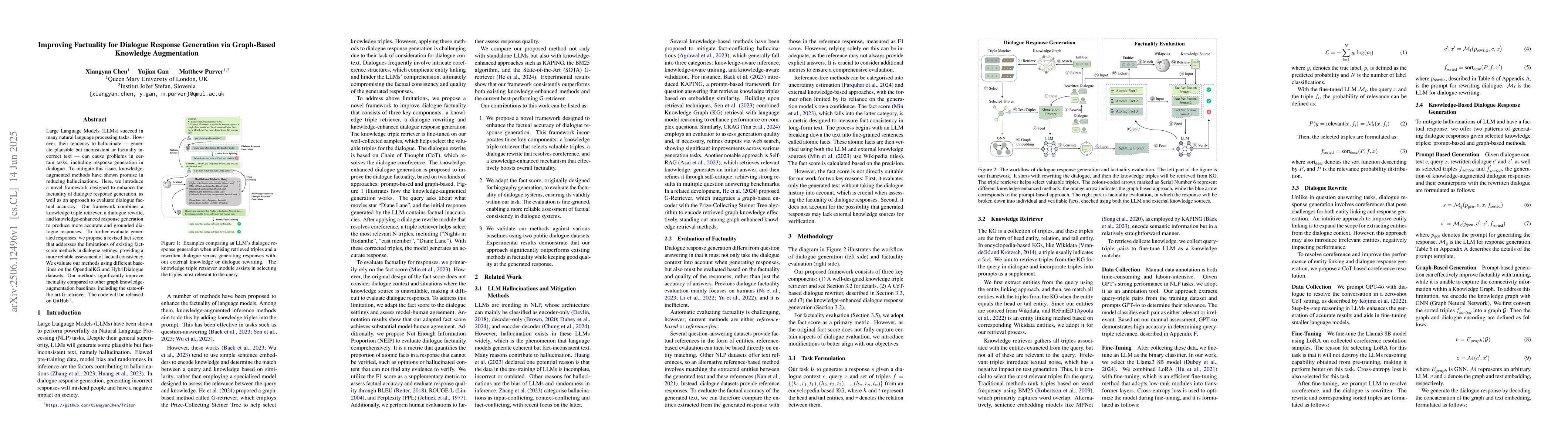 Large Language Models (LLMs) succeed in many natural language processing tasks. However, their tendency to hallucinate - generate plausible but inconsistent or factually incorrect text - can cause problems in certain tasks, including response generation in dialogue. To mitigate this issue, knowledge-augmented methods have shown promise in reducing hallucinations. Here, we introduce a novel framework designed to enhance the factuality of dialogue response generation, as well as an approach to evaluate dialogue factual accuracy. Our framework combines a knowledge triple retriever, a dialogue rewrite, and knowledge-enhanced response generation to produce more accurate and grounded dialogue responses. To further evaluate generated responses, we propose a revised fact score that addresses the limitations of existing fact-score methods in dialogue settings, providing a more reliable assessment of factual consistency. We evaluate our methods using different baselines on the OpendialKG and HybriDialogue datasets. Our methods significantly improve factuality compared to other graph knowledge-augmentation baselines, including the state-of-the-art G-retriever. The code will be released on GitHub.