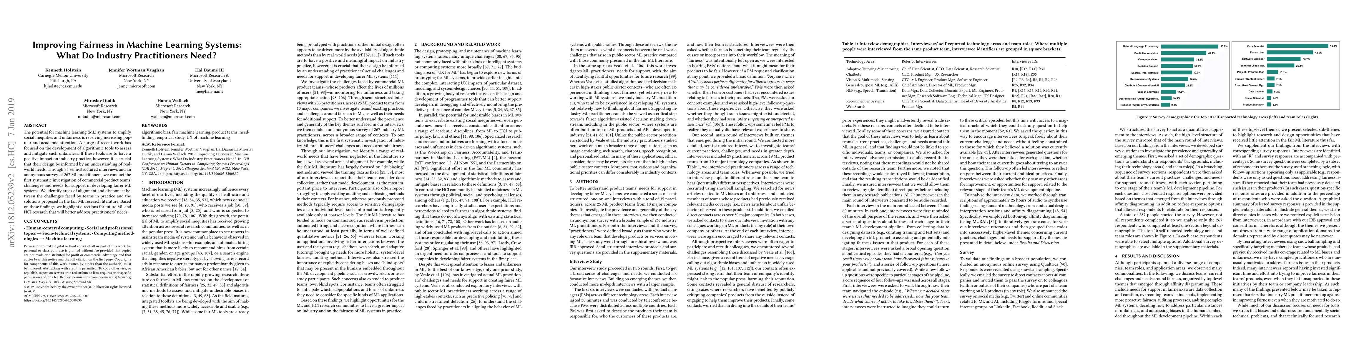 The potential for machine learning (ML) systems to amplify social inequities and unfairness is receiving increasing popular and academic attention. A surge of recent work has focused on the development of algorithmic tools to assess and mitigate such unfairness. If these tools are to have a positive impact on industry practice, however, it is crucial that their design be informed by an understanding of real-world needs. Through 35 semi-structured interviews and an anonymous survey of 267 ML practitioners, we conduct the first systematic investigation of commercial product teams' challenges and needs for support in developing fairer ML systems. We identify areas of alignment and disconnect between the challenges faced by industry practitioners and solutions proposed in the fair ML research literature. Based on these findings, we highlight directions for future ML and HCI research that will better address industry practitioners' needs.