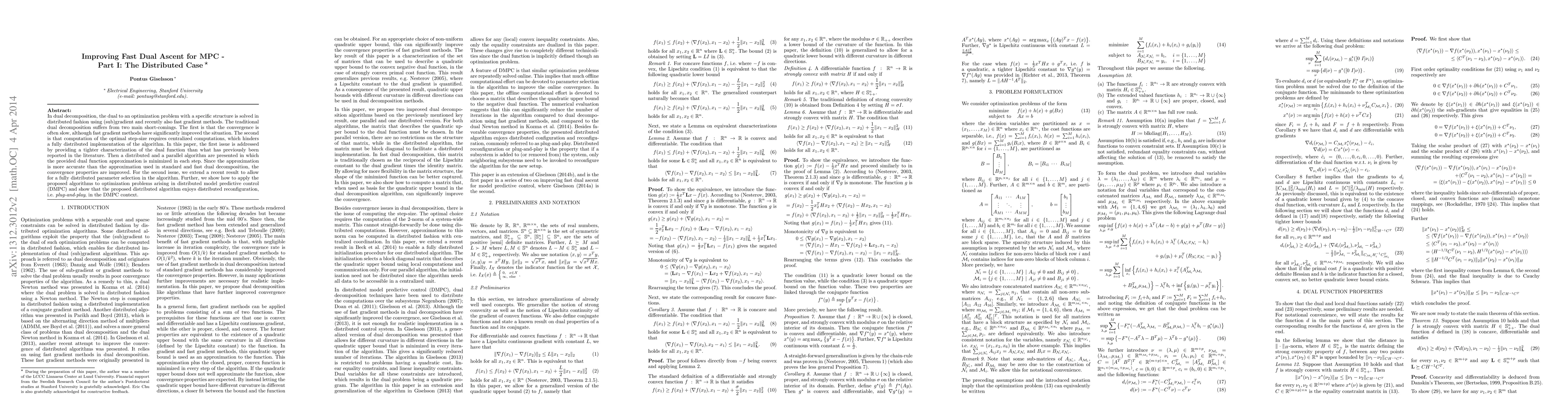 In dual decomposition, the dual to an optimization problem with a specific structure is solved in distributed fashion using (sub)gradient and recently also fast gradient methods. The traditional dual decomposition suffers from two main short-comings. The first is that the convergence is often slow, although fast gradient methods have significantly improved the situation. The second is that computation of the optimal step-size requires centralized computations, which hinders a fully distributed implementation of the algorithm. In this paper, the first issue is addressed by providing a tighter characterization of the dual function than what has previously been reported in the literature. Then a distributed and a parallel algorithm are presented in which the provided dual function approximation is minimized in each step. Since the approximation is more accurate than the approximation used in standard and fast dual decomposition, the convergence properties are improved. For the second issue, we extend a recent result to allow for a fully distributed parameter selection in the algorithm. Further, we show how to apply the proposed algorithms to optimization problems arising in distributed model predictive control (DMPC) and show that the proposed distributed algorithm enjoys distributed reconfiguration, i.e. plug-and-play, in the DMPC context.
