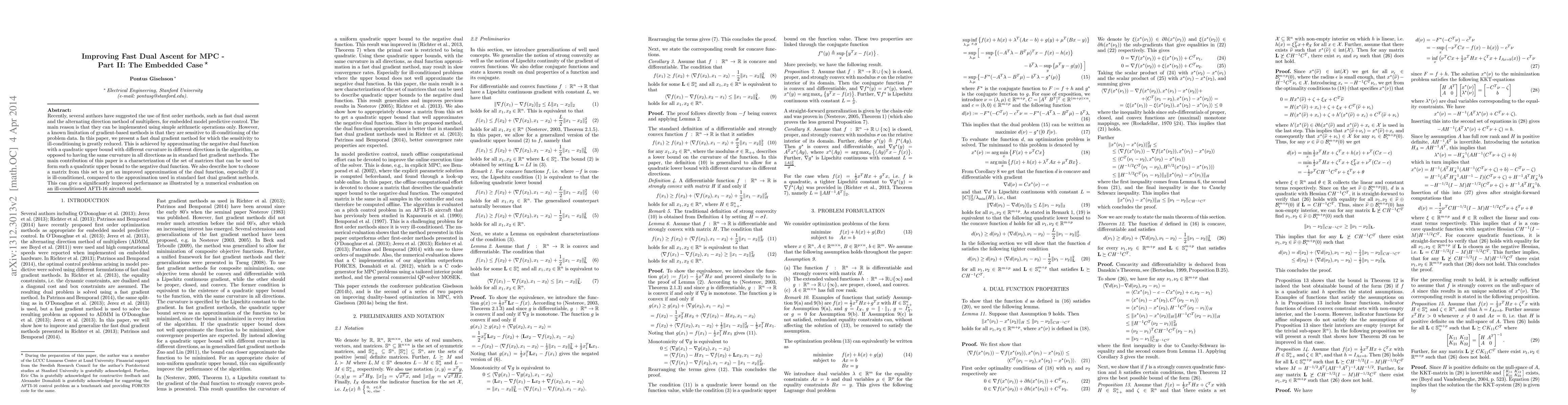 Recently, several authors have suggested the use of first order methods, such as fast dual ascent and the alternating direction method of multipliers, for embedded model predictive control. The main reason is that they can be implemented using simple arithmetic operations only. However, a known limitation of gradient-based methods is that they are sensitive to ill-conditioning of the problem data. In this paper, we present a fast dual gradient method for which the sensitivity to ill-conditioning is greatly reduced. This is achieved by approximating the negative dual function with a quadratic upper bound with different curvature in different directions in the algorithm, as opposed to having the same curvature in all directions as in standard fast gradient methods. The main contribution of this paper is a characterization of the set of matrices that can be used to form such a quadratic upper bound to the negative dual function. We also describe how to choose a matrix from this set to get an improved approximation of the dual function, especially if it is ill-conditioned, compared to the approximation used in standard fast dual gradient methods. This can give a significantly improved performance as illustrated by a numerical evaluation on an ill-conditioned AFTI-16 aircraft model.