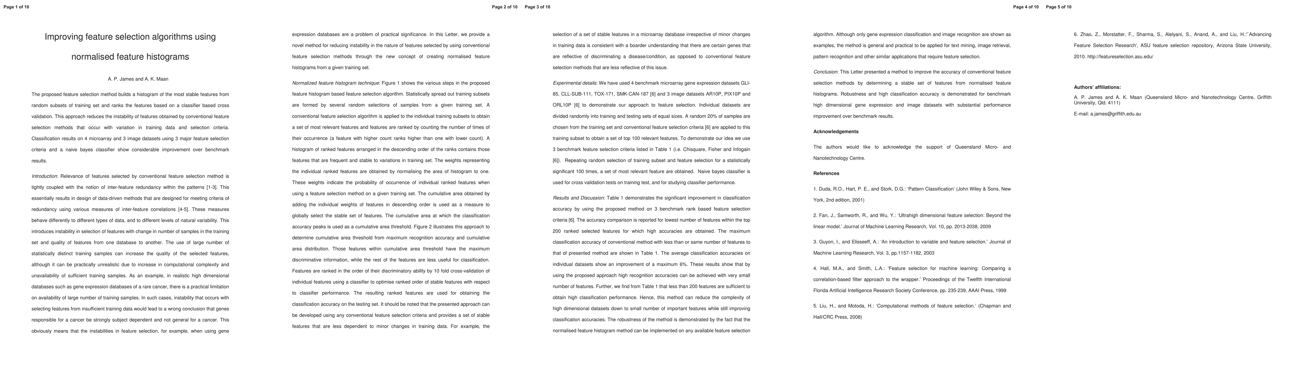 A new feature selection method reduces instability in training data and improves classification results on microarray and image datasets using normalized histograms.