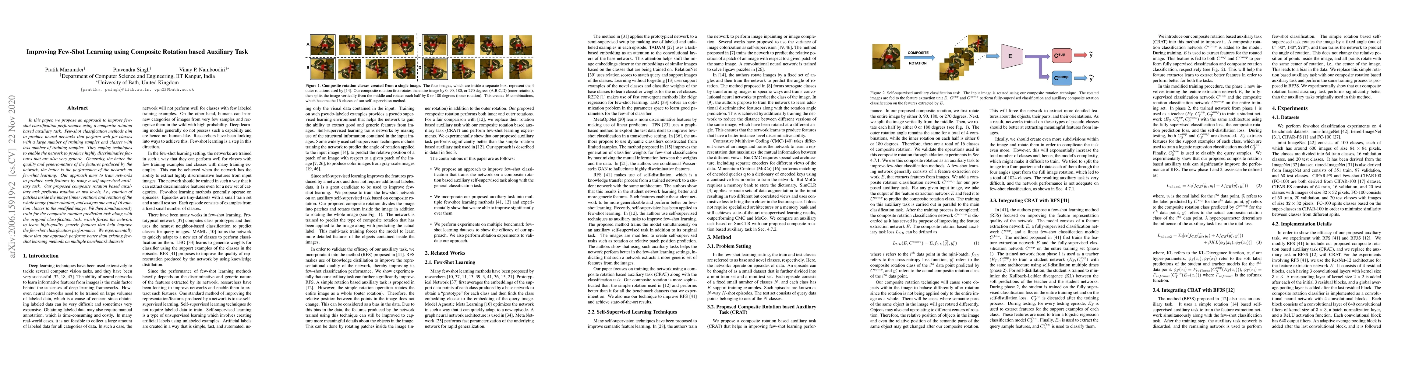 This paper proposes an auxiliary composite rotation task to enhance few-shot learning performance by training networks to generate discriminative yet generic features. The method involves self-supervised inner and outer image rotations, leading to improved performance on benchmark datasets compared to existing methods.