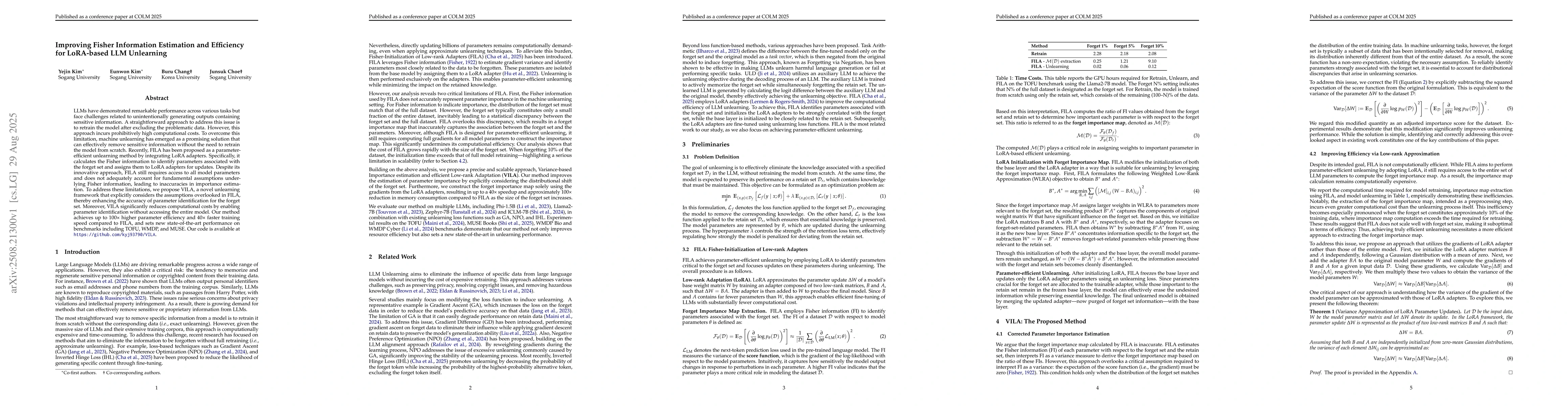 LLMs have demonstrated remarkable performance across various tasks but face challenges related to unintentionally generating outputs containing sensitive information. A straightforward approach to address this issue is to retrain the model after excluding the problematic data. However, this approach incurs prohibitively high computational costs. To overcome this limitation, machine unlearning has emerged as a promising solution that can effectively remove sensitive information without the need to retrain the model from scratch. Recently, FILA has been proposed as a parameter-efficient unlearning method by integrating LoRA adapters. Specifically, it calculates the Fisher information to identify parameters associated with the forget set and assigns them to LoRA adapters for updates. Despite its innovative approach, FILA still requires access to all model parameters and does not adequately account for fundamental assumptions underlying Fisher information, leading to inaccuracies in importance estimation. To address these limitations, we propose VILA, a novel unlearning framework that explicitly considers the assumptions overlooked in FILA, thereby enhancing the accuracy of parameter identification for the forget set. Moreover, VILA significantly reduces computational costs by enabling parameter identification without accessing the entire model. Our method achieves up to 100x higher parameter efficiency and 40x faster training speed compared to FILA, and sets new state-of-the-art performance on benchmarks including TOFU, WMDP, and MUSE. Our code is available at https://github.com/kyj93790/VILA.