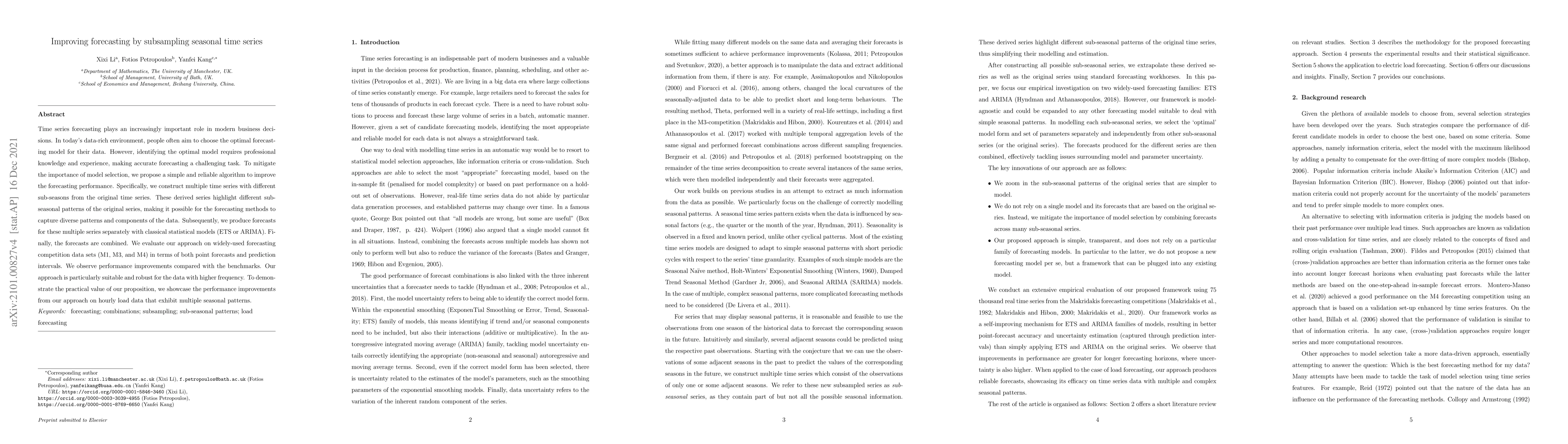 This paper proposes a method to enhance time series forecasting by subsampling seasonal data to create multiple time series that highlight different sub-seasonal patterns. The forecasts from classical statistical models are then combined, showing improved performance on benchmark datasets and practical applications on hourly load data.