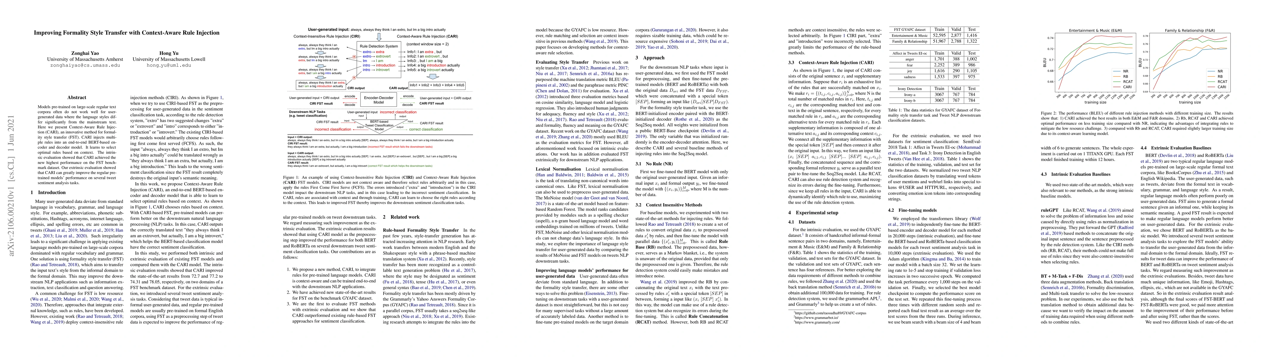 Models pre-trained on large-scale regular text corpora often do not work well for user-generated data where the language styles differ significantly from the mainstream text. Here we present Context-Aware Rule Injection (CARI), an innovative method for formality style transfer (FST). CARI injects multiple rules into an end-to-end BERT-based encoder and decoder model. It learns to select optimal rules based on context. The intrinsic evaluation showed that CARI achieved the new highest performance on the FST benchmark dataset. Our extrinsic evaluation showed that CARI can greatly improve the regular pre-trained models' performance on several tweet sentiment analysis tasks.