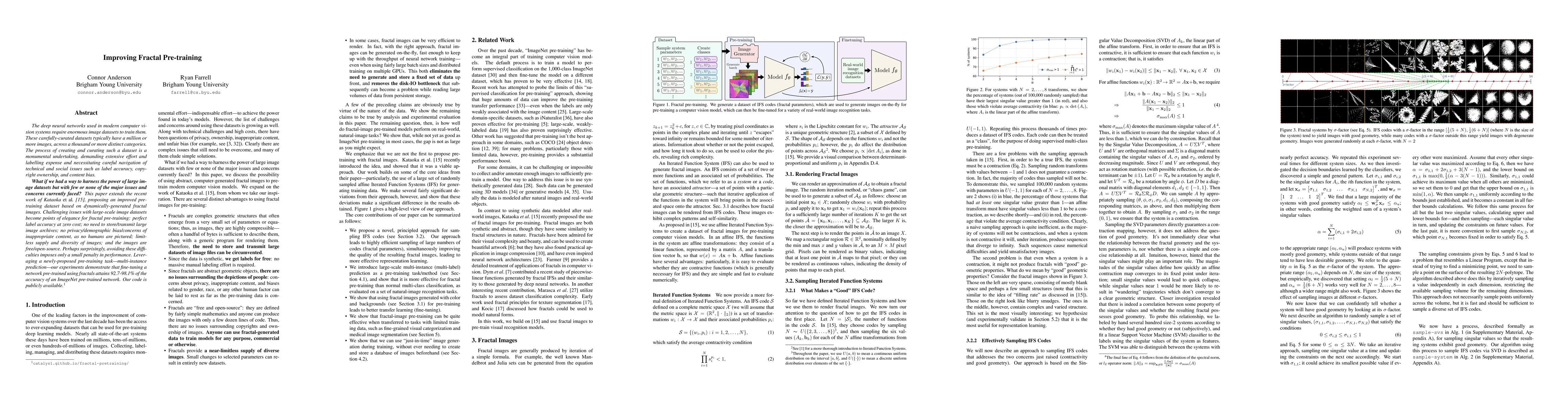 The deep neural networks used in modern computer vision systems require enormous image datasets to train them. These carefully-curated datasets typically have a million or more images, across a thousand or more distinct categories. The process of creating and curating such a dataset is a monumental undertaking, demanding extensive effort and labelling expense and necessitating careful navigation of technical and social issues such as label accuracy, copyright ownership, and content bias. What if we had a way to harness the power of large image datasets but with few or none of the major issues and concerns currently faced? This paper extends the recent work of Kataoka et. al. (2020), proposing an improved pre-training dataset based on dynamically-generated fractal images. Challenging issues with large-scale image datasets become points of elegance for fractal pre-training: perfect label accuracy at zero cost; no need to store/transmit large image archives; no privacy/demographic bias/concerns of inappropriate content, as no humans are pictured; limitless supply and diversity of images; and the images are free/open-source. Perhaps surprisingly, avoiding these difficulties imposes only a small penalty in performance. Leveraging a newly-proposed pre-training task -- multi-instance prediction -- our experiments demonstrate that fine-tuning a network pre-trained using fractals attains 92.7-98.1% of the accuracy of an ImageNet pre-trained network.