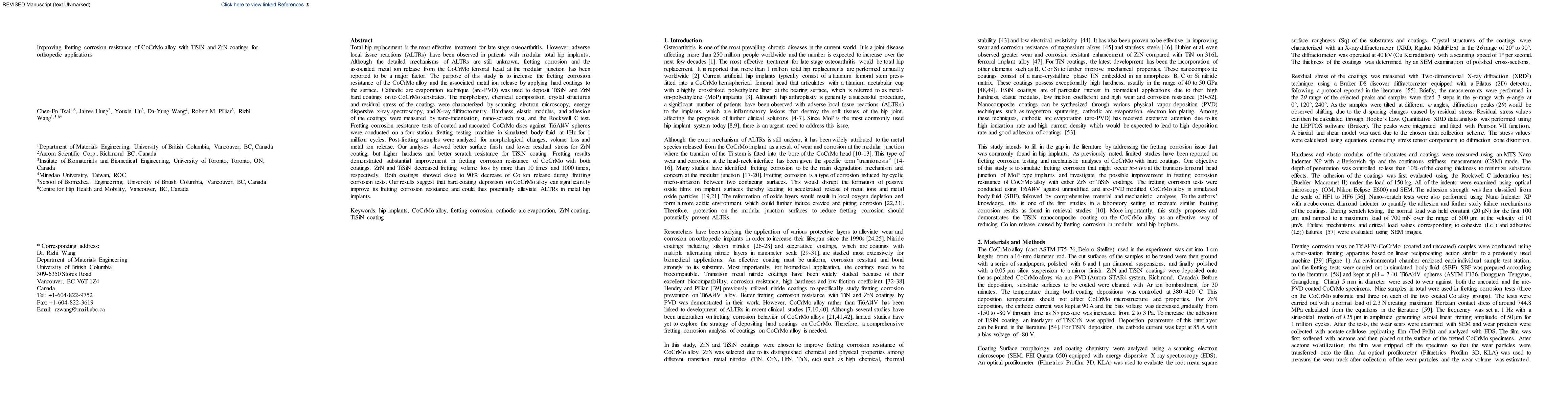 This study investigates the enhancement of fretting corrosion resistance in CoCrMo alloy for orthopedic implants by applying TiSiN and ZrN coatings using arc-PVD. The results show that both coatings significantly reduce fretting volume loss and metal ion release, suggesting they could mitigate adverse local tissue reactions in hip implants.