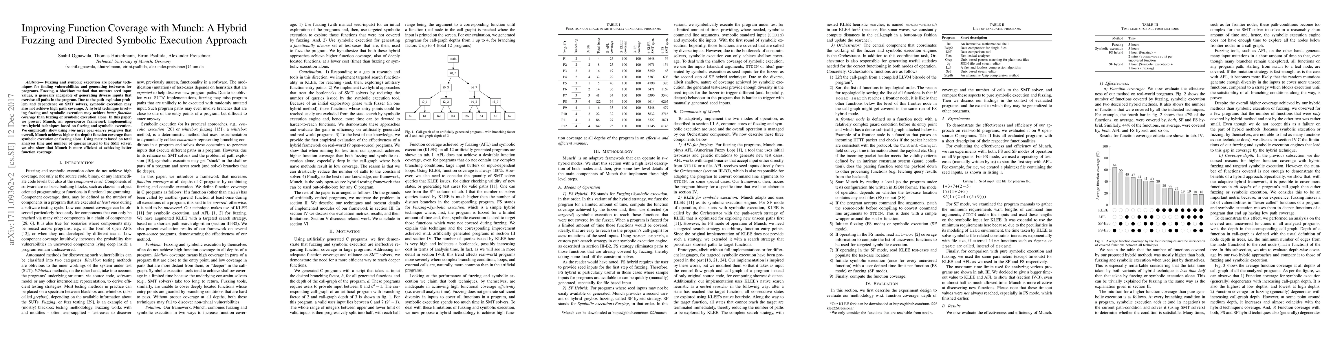 Title: Improving Function Coverage with Munch: A Hybrid Fuzzing and Directed Symbolic Execution Approach Summary: Munch combines fuzzing and symbolic execution to achieve superior function coverage and efficiency compared to using either method alone, as demonstrated through analysis of nine large open-source programs.