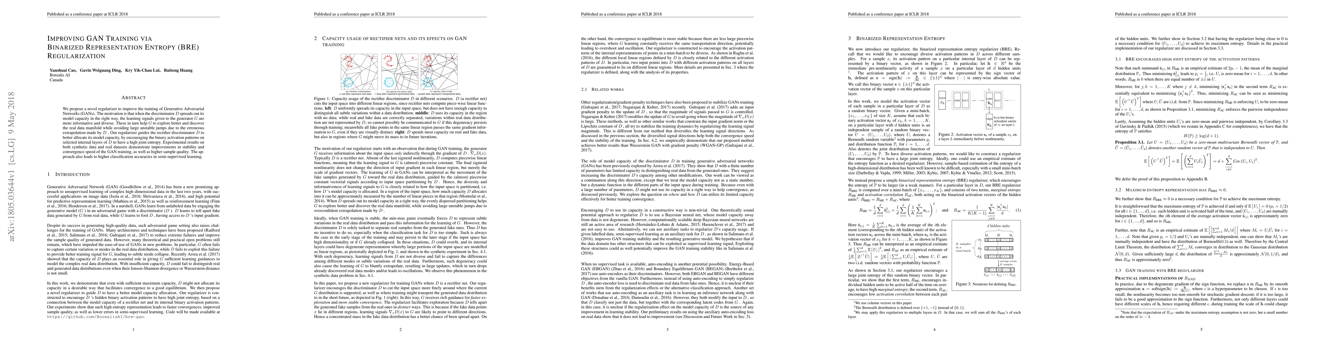 A new regularizer called Binarized Representation Entropy (BRE) improves GAN training by guiding the discriminator to allocate its capacity effectively, leading to more stable and faster convergence with higher sample quality.