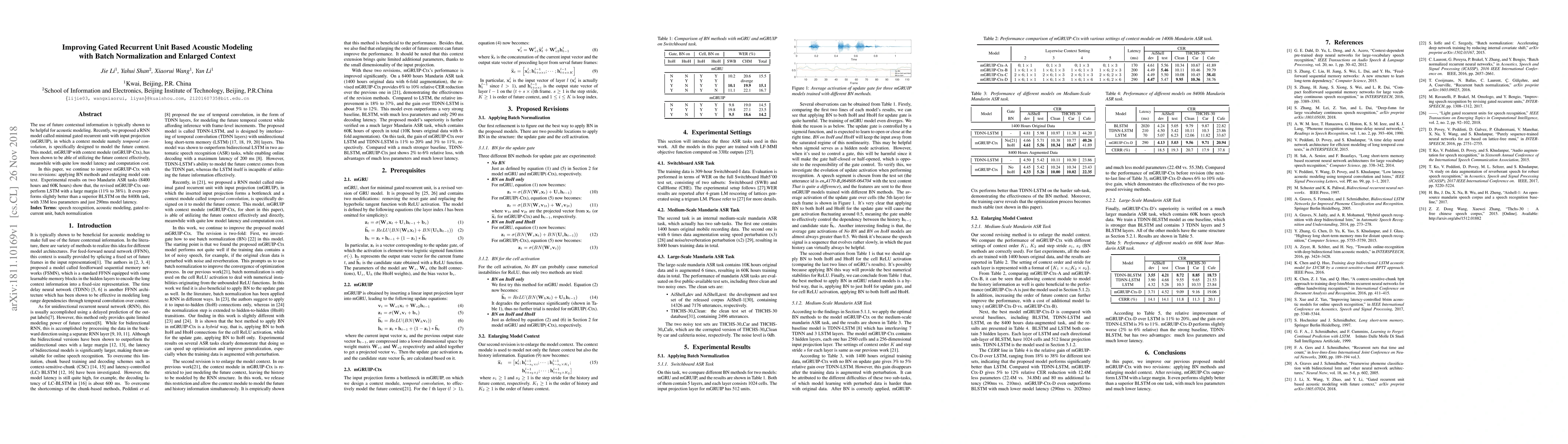 This paper enhances the mGRUIP-Ctx model for acoustic modeling by incorporating batch normalization and expanding the context window, achieving significant improvements over LSTM and BLSTM models in Mandarin ASR tasks, with lower parameter count and latency. The revised model demonstrates superior performance with a large margin, especially on longer datasets.
