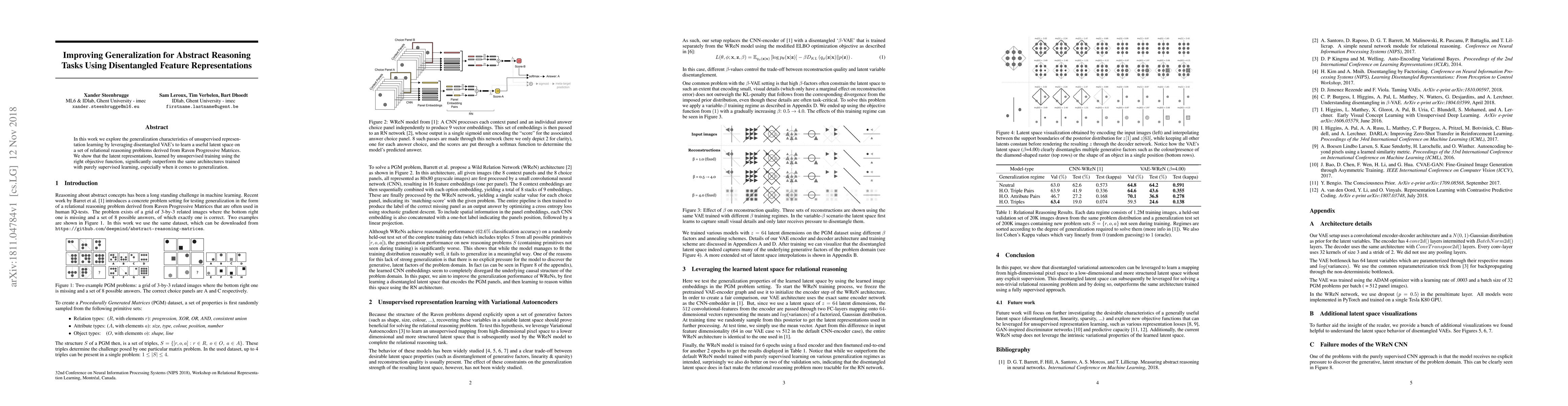 This paper investigates how unsupervised representation learning with disentangled VAEs enhances generalization in abstract reasoning tasks, specifically on relational problems derived from Raven Progressive Matrices. The results demonstrate that these latent representations outperform supervised learning methods, particularly in generalization.