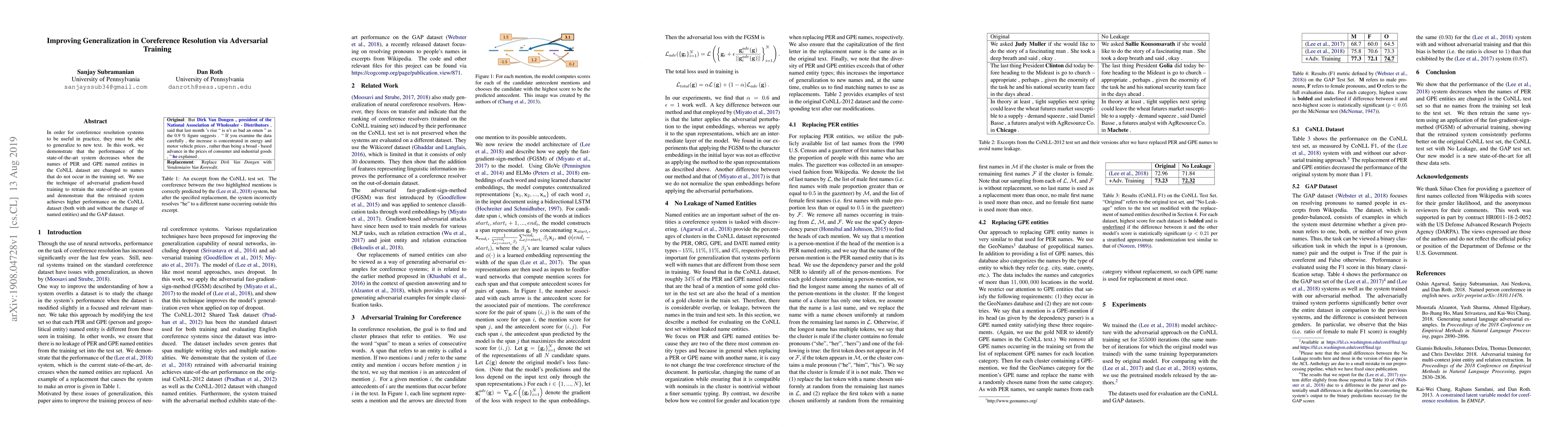 In order for coreference resolution systems to be useful in practice, they must be able to generalize to new text. In this work, we demonstrate that the performance of the state-of-the-art system decreases when the names of PER and GPE named entities in the CoNLL dataset are changed to names that do not occur in the training set. We use the technique of adversarial gradient-based training to retrain the state-of-the-art system and demonstrate that the retrained system achieves higher performance on the CoNLL dataset (both with and without the change of named entities) and the GAP dataset.