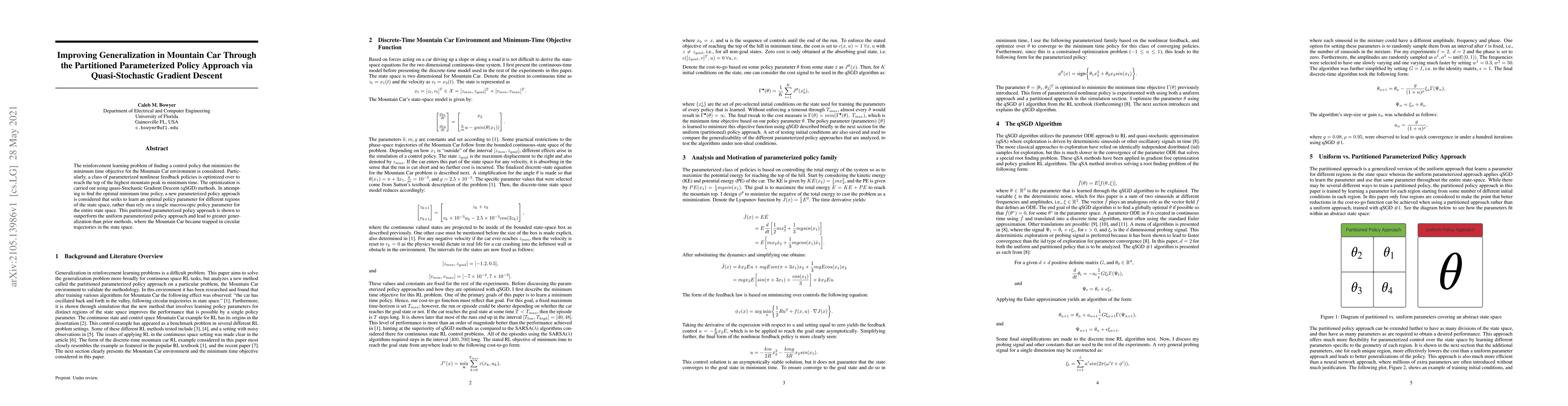 The reinforcement learning problem of finding a control policy that minimizes the minimum time objective for the Mountain Car environment is considered. Particularly, a class of parameterized nonlinear feedback policies is optimized over to reach the top of the highest mountain peak in minimum time. The optimization is carried out using quasi-Stochastic Gradient Descent (qSGD) methods. In attempting to find the optimal minimum time policy, a new parameterized policy approach is considered that seeks to learn an optimal policy parameter for different regions of the state space, rather than rely on a single macroscopic policy parameter for the entire state space. This partitioned parameterized policy approach is shown to outperform the uniform parameterized policy approach and lead to greater generalization than prior methods, where the Mountain Car became trapped in circular trajectories in the state space.