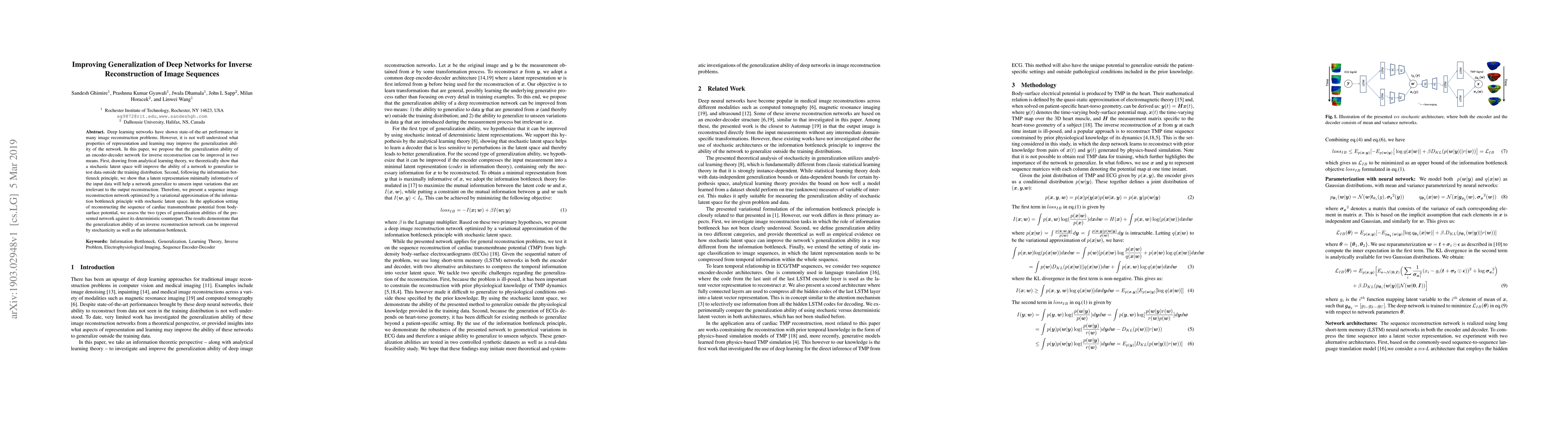 Deep learning networks have shown state-of-the-art performance in many image reconstruction problems. However, it is not well understood what properties of representation and learning may improve the generalization ability of the network. In this paper, we propose that the generalization ability of an encoder-decoder network for inverse reconstruction can be improved in two means. First, drawing from analytical learning theory, we theoretically show that a stochastic latent space will improve the ability of a network to generalize to test data outside the training distribution. Second, following the information bottleneck principle, we show that a latent representation minimally informative of the input data will help a network generalize to unseen input variations that are irrelevant to the output reconstruction. Therefore, we present a sequence image reconstruction network optimized by a variational approximation of the information bottleneck principle with stochastic latent space. In the application setting of reconstructing the sequence of cardiac transmembrane potential from bodysurface potential, we assess the two types of generalization abilities of the presented network against its deterministic counterpart. The results demonstrate that the generalization ability of an inverse reconstruction network can be improved by stochasticity as well as the information bottleneck.