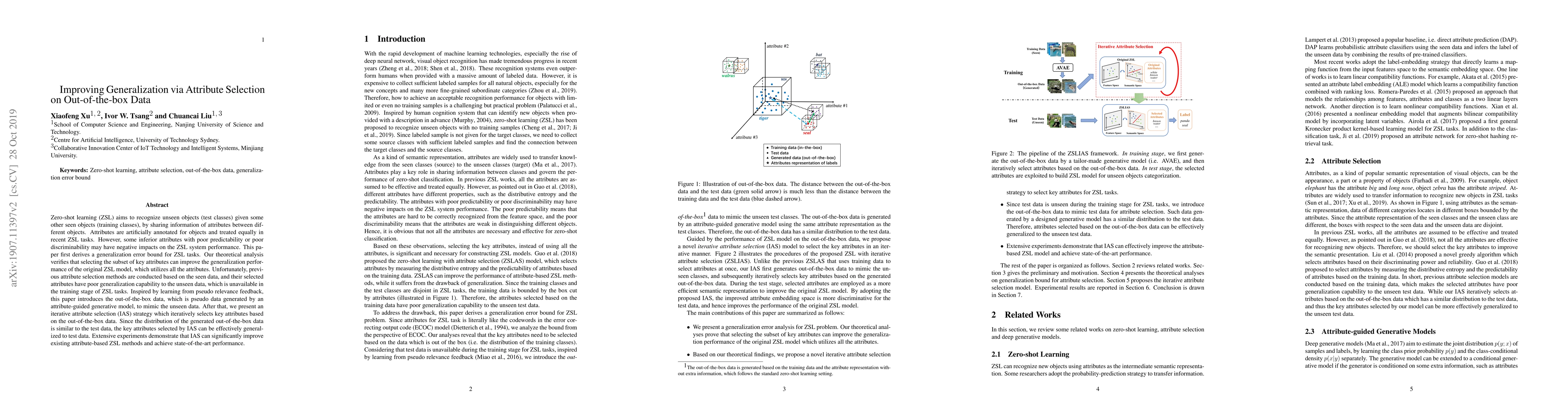 Zero-shot learning (ZSL) aims to recognize unseen objects (test classes) given some other seen objects (training classes), by sharing information of attributes between different objects. Attributes are artificially annotated for objects and treated equally in recent ZSL tasks. However, some inferior attributes with poor predictability or poor discriminability may have negative impacts on the ZSL system performance. This paper first derives a generalization error bound for ZSL tasks. Our theoretical analysis verifies that selecting the subset of key attributes can improve the generalization performance of the original ZSL model, which utilizes all the attributes. Unfortunately, previous attribute selection methods are conducted based on the seen data, and their selected attributes have poor generalization capability to the unseen data, which is unavailable in the training stage of ZSL tasks. Inspired by learning from pseudo relevance feedback, this paper introduces the out-of-the-box data, which is pseudo data generated by an attribute-guided generative model, to mimic the unseen data. After that, we present an iterative attribute selection (IAS) strategy which iteratively selects key attributes based on the out-of-the-box data. Since the distribution of the generated out-of-the-box data is similar to the test data, the key attributes selected by IAS can be effectively generalized to test data. Extensive experiments demonstrate that IAS can significantly improve existing attribute-based ZSL methods and achieve state-of-the-art performance.