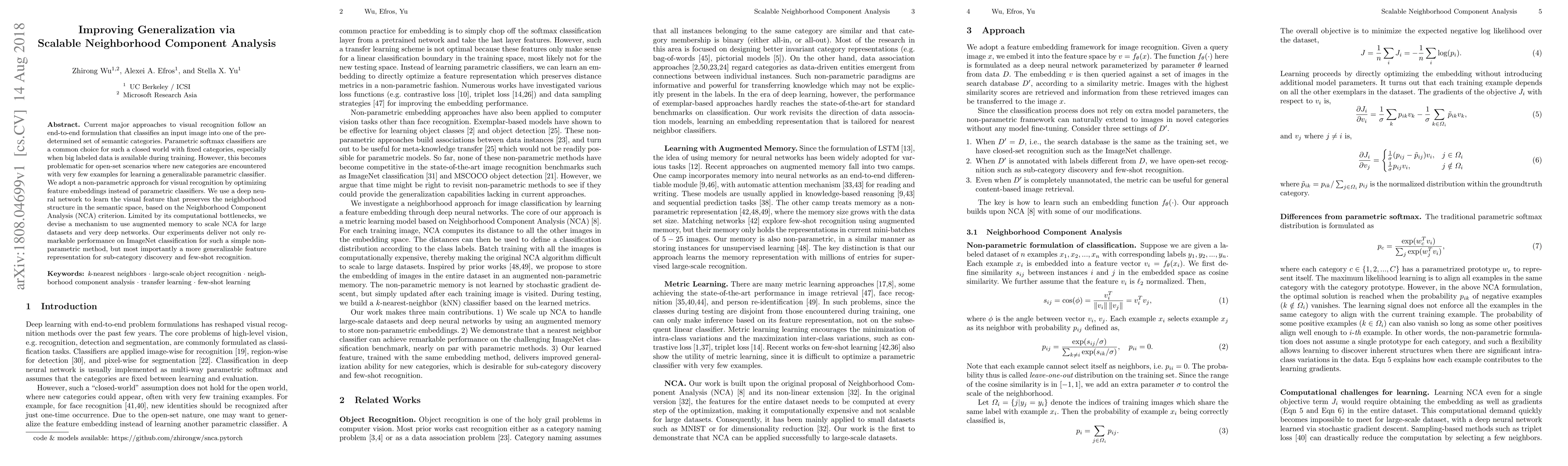Current major approaches to visual recognition follow an end-to-end formulation that classifies an input image into one of the pre-determined set of semantic categories. Parametric softmax classifiers are a common choice for such a closed world with fixed categories, especially when big labeled data is available during training. However, this becomes problematic for open-set scenarios where new categories are encountered with very few examples for learning a generalizable parametric classifier. We adopt a non-parametric approach for visual recognition by optimizing feature embeddings instead of parametric classifiers. We use a deep neural network to learn the visual feature that preserves the neighborhood structure in the semantic space, based on the Neighborhood Component Analysis (NCA) criterion. Limited by its computational bottlenecks, we devise a mechanism to use augmented memory to scale NCA for large datasets and very deep networks. Our experiments deliver not only remarkable performance on ImageNet classification for such a simple non-parametric method, but most importantly a more generalizable feature representation for sub-category discovery and few-shot recognition.