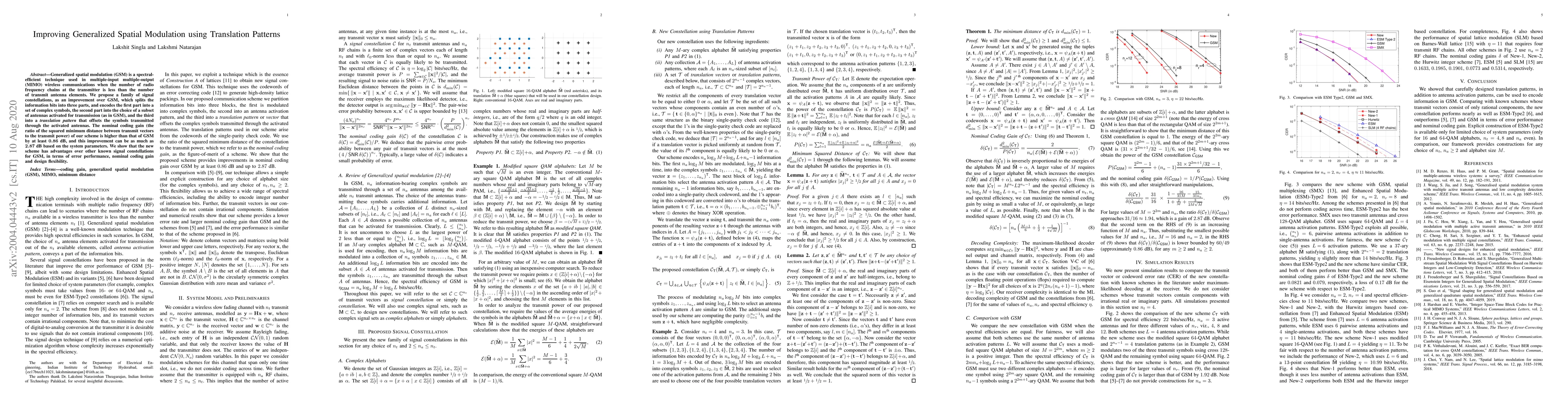 This research introduces a new signal constellation for Generalized Spatial Modulation (GSM) in MIMO wireless communications, which enhances spectral efficiency by splitting information bits into three parts. The first encodes complex symbols, the second selects antenna subsets for transmission, and the third applies translation patterns to offset symbols. The new scheme outperforms GSM with a higher nominal coding gain (up to 2.87 dB) and demonstrates advantages in error performance and design flexibility compared to other known constellations.