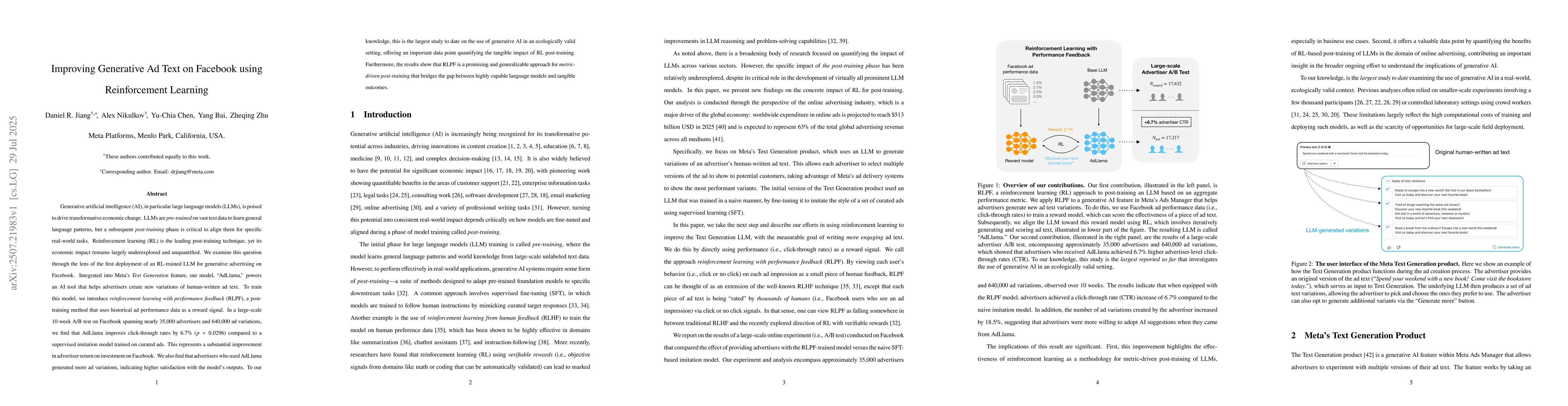 Generative artificial intelligence (AI), in particular large language models (LLMs), is poised to drive transformative economic change. LLMs are pre-trained on vast text data to learn general language patterns, but a subsequent post-training phase is critical to align them for specific real-world tasks. Reinforcement learning (RL) is the leading post-training technique, yet its economic impact remains largely underexplored and unquantified. We examine this question through the lens of the first deployment of an RL-trained LLM for generative advertising on Facebook. Integrated into Meta's Text Generation feature, our model, "AdLlama," powers an AI tool that helps advertisers create new variations of human-written ad text. To train this model, we introduce reinforcement learning with performance feedback (RLPF), a post-training method that uses historical ad performance data as a reward signal. In a large-scale 10-week A/B test on Facebook spanning nearly 35,000 advertisers and 640,000 ad variations, we find that AdLlama improves click-through rates by 6.7% (p=0.0296) compared to a supervised imitation model trained on curated ads. This represents a substantial improvement in advertiser return on investment on Facebook. We also find that advertisers who used AdLlama generated more ad variations, indicating higher satisfaction with the model's outputs. To our knowledge, this is the largest study to date on the use of generative AI in an ecologically valid setting, offering an important data point quantifying the tangible impact of RL post-training. Furthermore, the results show that RLPF is a promising and generalizable approach for metric-driven post-training that bridges the gap between highly capable language models and tangible outcomes.