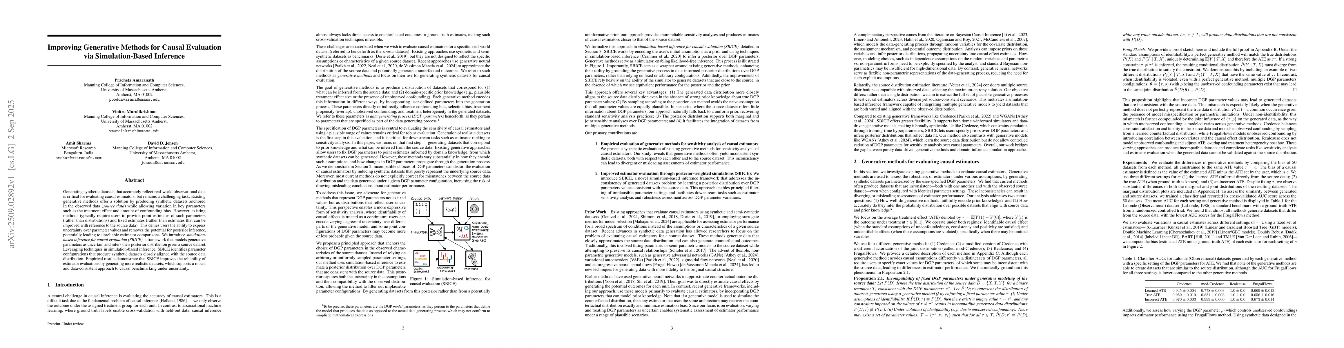 Generating synthetic datasets that accurately reflect real-world observational data is critical for evaluating causal estimators, but remains a challenging task. Existing generative methods offer a solution by producing synthetic datasets anchored in the observed data (source data) while allowing variation in key parameters such as the treatment effect and amount of confounding bias. However, existing methods typically require users to provide point estimates of such parameters (rather than distributions) and fixed estimates (rather than estimates that can be improved with reference to the source data). This denies users the ability to express uncertainty over parameter values and removes the potential for posterior inference, potentially leading to unreliable estimator comparisons. We introduce simulation-based inference for causal evaluation (SBICE), a framework that models generative parameters as uncertain and infers their posterior distribution given a source dataset. Leveraging techniques in simulation-based inference, SBICE identifies parameter configurations that produce synthetic datasets closely aligned with the source data distribution. Empirical results demonstrate that SBICE improves the reliability of estimator evaluations by generating more realistic datasets, which supports a robust and data-consistent approach to causal benchmarking under uncertainty.