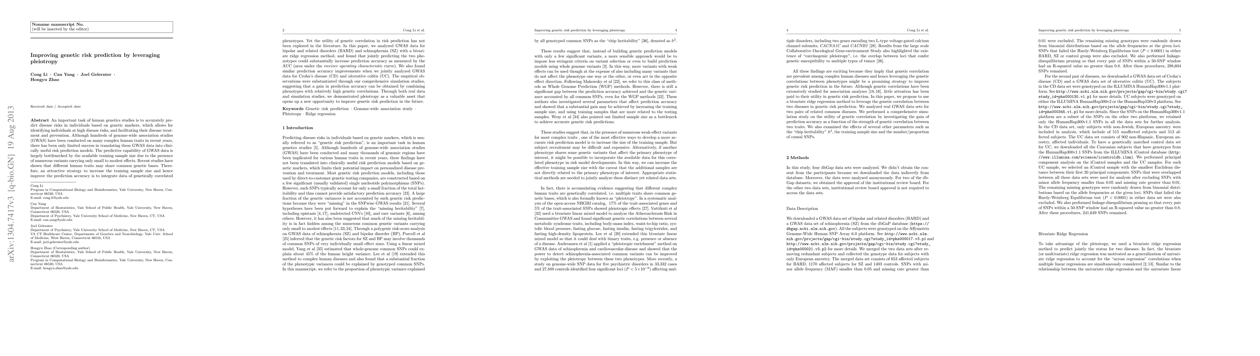 This paper explores leveraging pleiotropy—whereby multiple traits share common genetic bases—to enhance genetic risk prediction models. By integrating GWAS data for genetically correlated phenotypes like bipolar and schizophrenia, the study demonstrates significant improvements in prediction accuracy, suggesting that combining such data can substantially boost the effectiveness of genetic risk prediction.