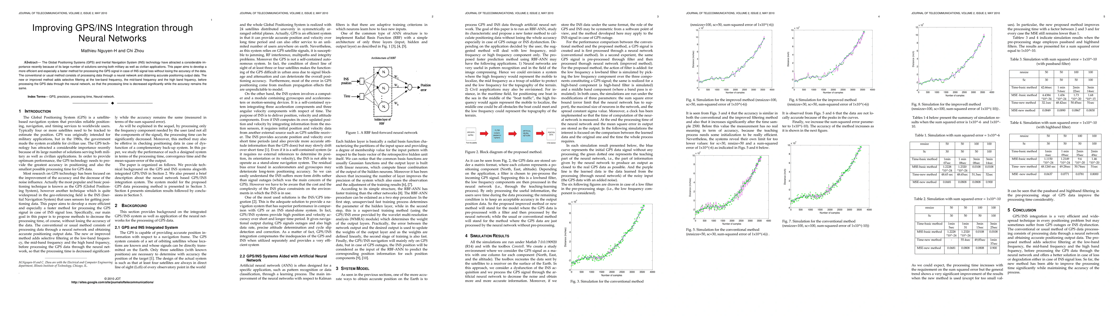 The Global Positioning Systems (GPS) and Inertial Navigation System (INS) technology have attracted a considerable importance recently because of its large number of solutions serving both military as well as civilian applications. This paper aims to develop a more efficient and especially a faster method for processing the GPS signal in case of INS signal loss without losing the accuracy of the data. The conventional or usual method consists of processing data through a neural network and obtaining accurate positioning output data. The new or improved method adds selective filtering at the low-band frequency, the mid-band frequency and the high band frquency, before processing the GPS data through the neural network, so that the processing time is decreased significantly while the accuracy remains the same.