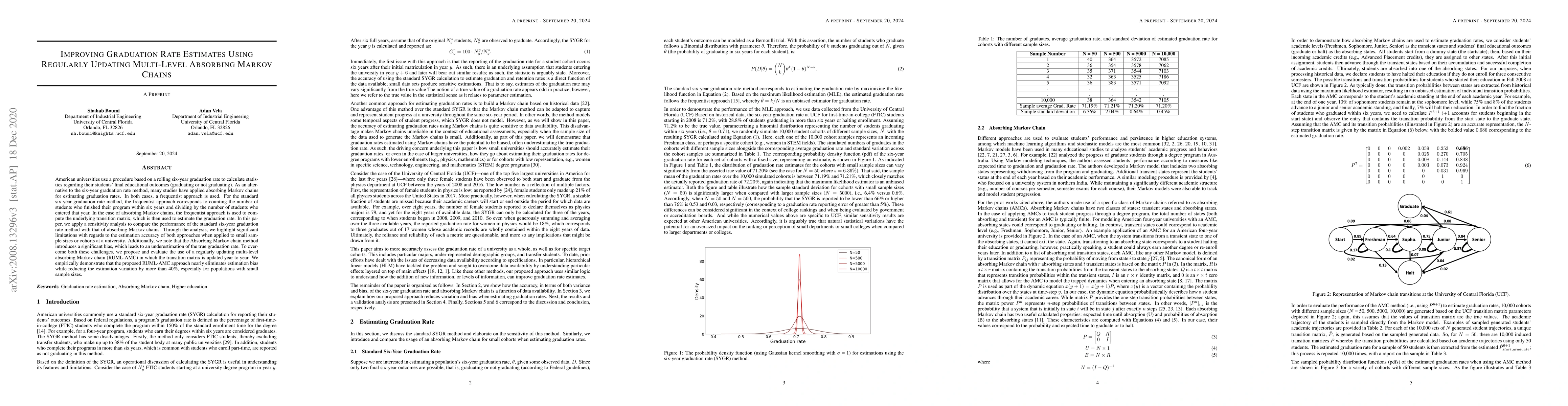 American universities use a procedure based on a rolling six-year graduation rate to calculate statistics regarding their students' final educational outcomes (graduating or not graduating). As~an alternative to the six-year graduation rate method, many studies have applied absorbing Markov chains for estimating graduation rates. In both cases, a frequentist approach is used. For~the standard six-year graduation rate method, the frequentist approach corresponds to counting the number of students who finished their program within six years and dividing by the number of students who entered that year. In the case of absorbing Markov chains, the frequentist approach is used to compute the underlying transition matrix, which is then used to estimate the graduation rate. In this paper, we apply a sensitivity analysis to compare the performance of the standard six-year graduation rate method with that of absorbing Markov chains. Through the analysis, we highlight significant limitations with regards to the estimation accuracy of both approaches when applied to small sample sizes or cohorts at a university. Additionally, we note that the Absorbing Markov chain method introduces a significant bias, which leads to an underestimation of the true graduation rate. To~overcome both these challenges, we propose and evaluate the use of a regularly updating multi-level absorbing Markov chain (RUML-AMC) in which the transition matrix is updated year to year. We empirically demonstrate that the proposed RUML-AMC approach nearly eliminates estimation bias while reducing the estimation variation by more than 40%, especially for populations with small sample sizes.