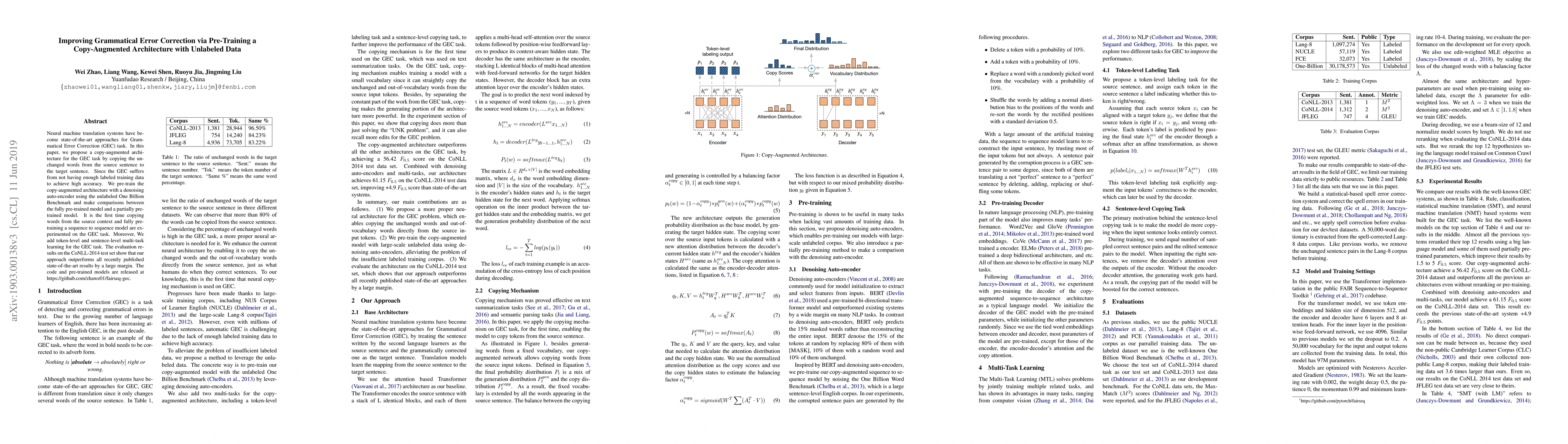 This paper proposes a copy-augmented neural architecture for Grammatical Error Correction (GEC) that leverages unlabeled data through pre-training with a denoising auto-encoder. The approach outperforms existing methods on the CoNLL-2014 test set, demonstrating the effectiveness of copying unchanged words and multi-task learning.