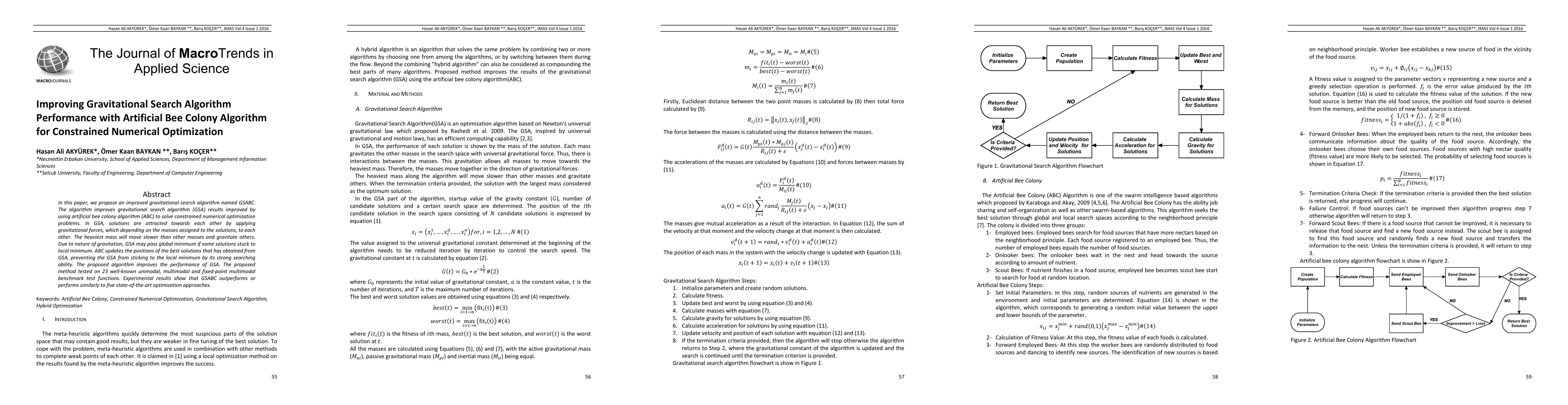 A new optimization algorithm called GSABC combines gravitational search with artificial bee colony to improve performance on constrained numerical problems. It outperforms or matches five state-of-the-art methods on 23 benchmark test functions.