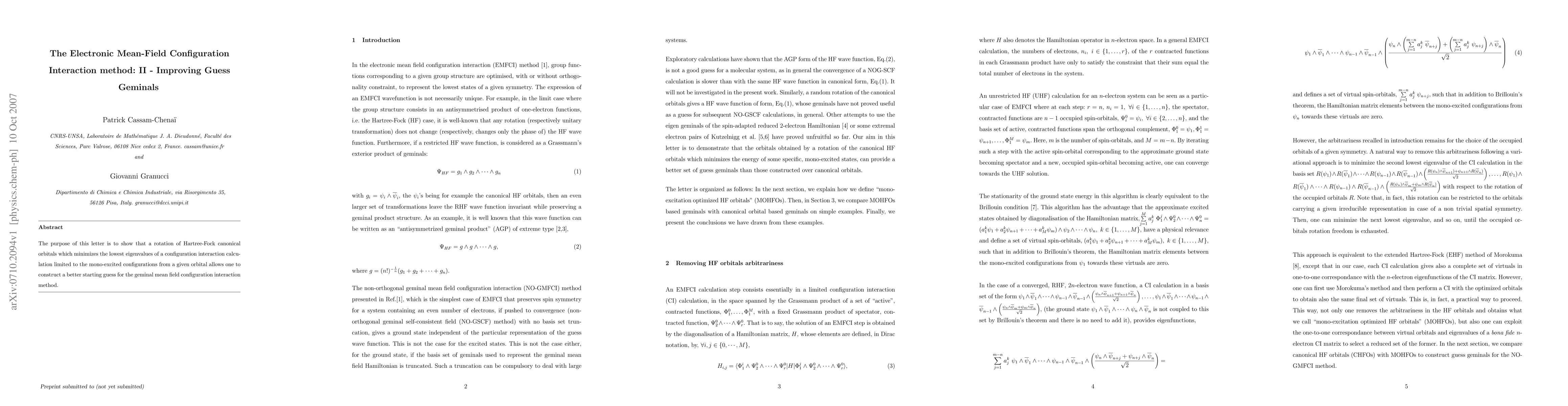 The purpose of this letter is to show that a rotation of Hartree-Fock canonical orbitals which minimizes the lowest eigenvalues of a configuration interaction calculation limited to the mono-excitated configurations from a given orbital allows one to construct a better starting guess for the geminal mean field configuration interaction method.