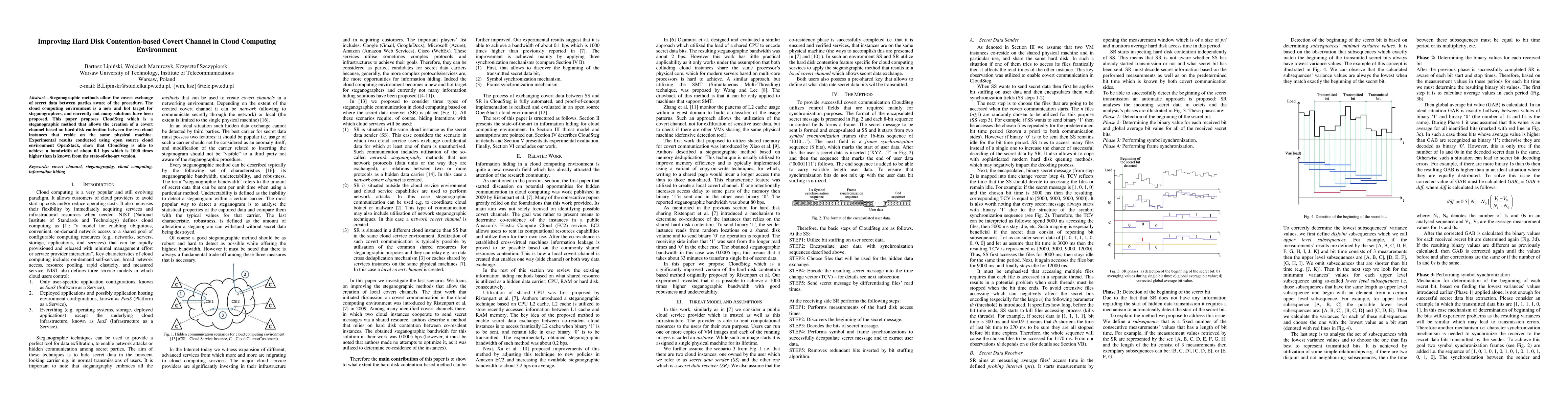 A new steganographic method called CloudSteg enhances covert data exchange in cloud computing by leveraging hard disk contention between instances on the same machine, achieving a significantly higher bandwidth than existing solutions.