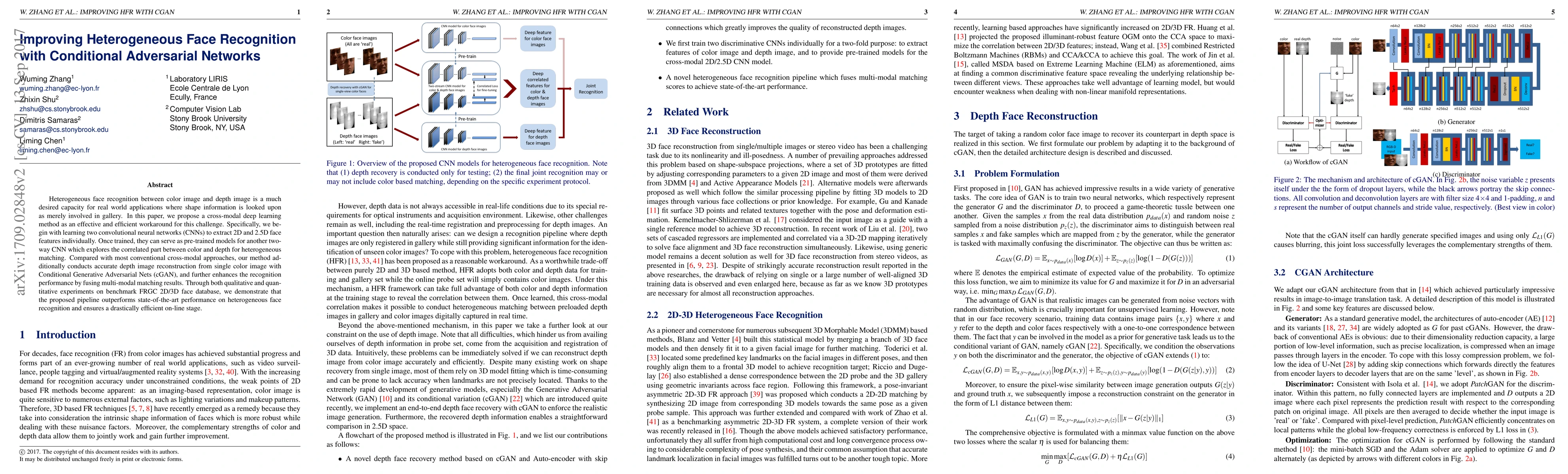 This paper proposes a cross-modal deep learning method for heterogeneous face recognition between color and depth images, utilizing CNNs and Conditional Generative Adversarial Networks (cGAN) to reconstruct depth images from color images, enhancing recognition performance through multi-modal matching. Experimental results show superior performance compared to state-of-the-art methods.
