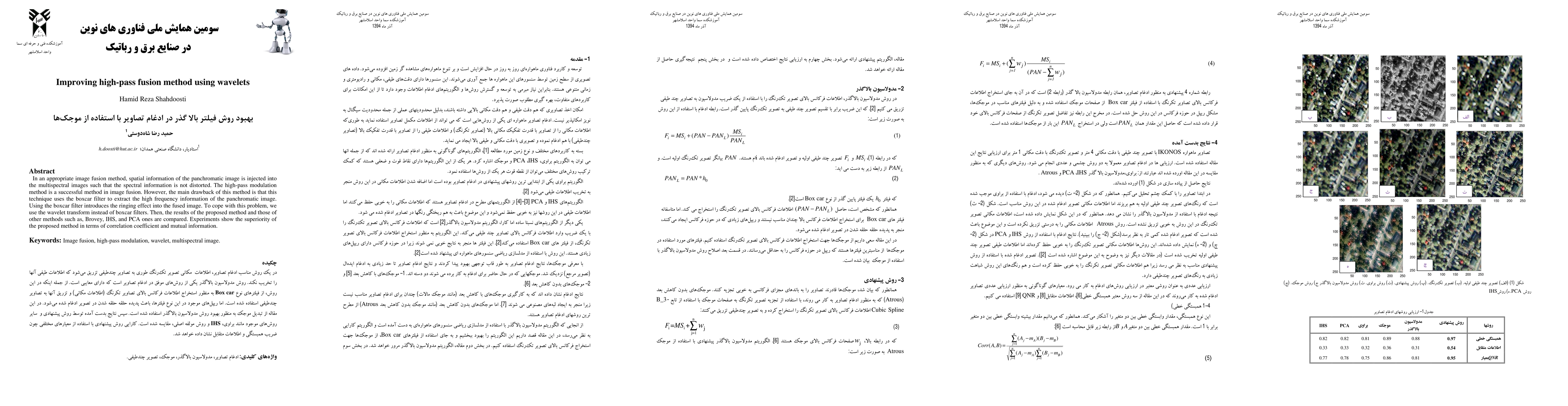This paper proposes an improved high-pass fusion method using wavelets for better image fusion, replacing boxcar filters to mitigate the ringing effect. Experimental results demonstrate superior performance in correlation coefficient and mutual information compared to traditional methods like Brovey, IHS, and PCA.