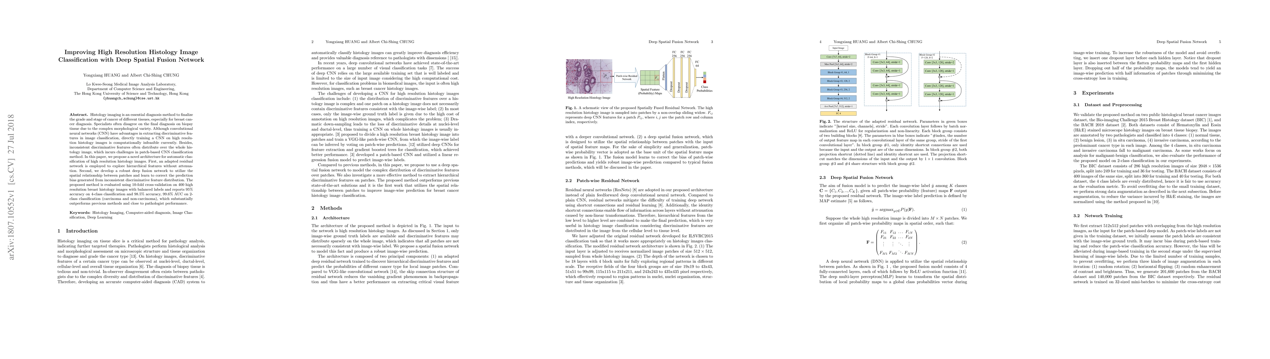 This paper proposes a deep spatial fusion network to improve the classification of high resolution histology images for breast cancer diagnosis, employing an adapted residual network for feature extraction and a deep fusion network to correct prediction biases, achieving 95% accuracy in 4-class and 98.5% accuracy in 2-class classification.
