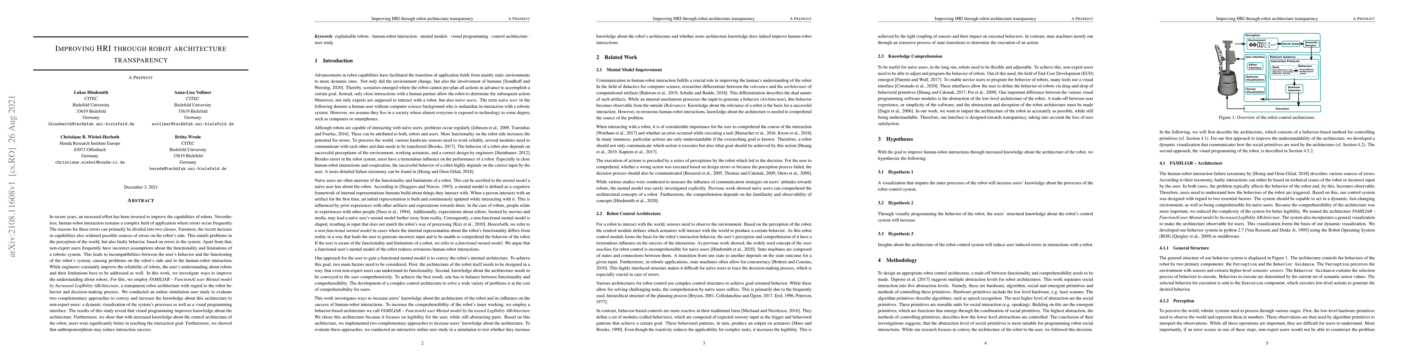 Researchers investigated ways to improve human-robot interaction by increasing transparency in robot architecture through dynamic visualization and visual programming interfaces, finding that users with increased knowledge about the control architecture achieved better interaction success.