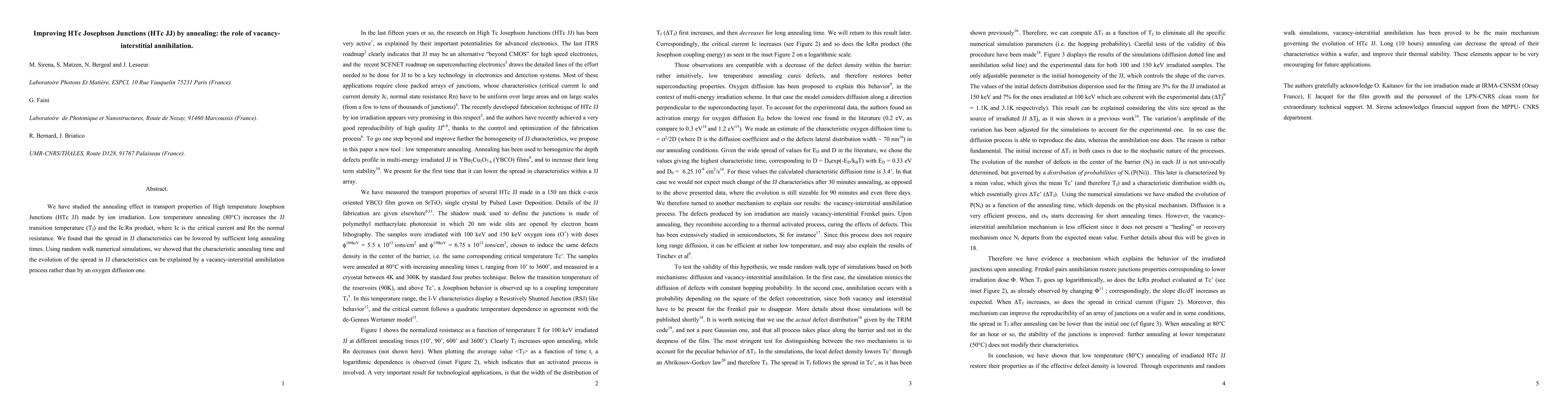 We have studied the annealing effect in transport properties of High temperature Josephson Junctions (HTc JJ) made by ion irradiation. Low temperature annealing (80 degrees Celsius) increases the JJ transition temperature (TJ) and the Ic.Rn product, where Ic is the critical current and Rn the normal resistance. We found that the spread in JJ characteristics can be lowered by sufficient long annealing times. Using random walk numerical simulations, we showed that the characteristic annealing time and the evolution of the spread in JJ characteristics can be explained by a vacancy-interstitial annihilation process rather than by an oxygen diffusion one.