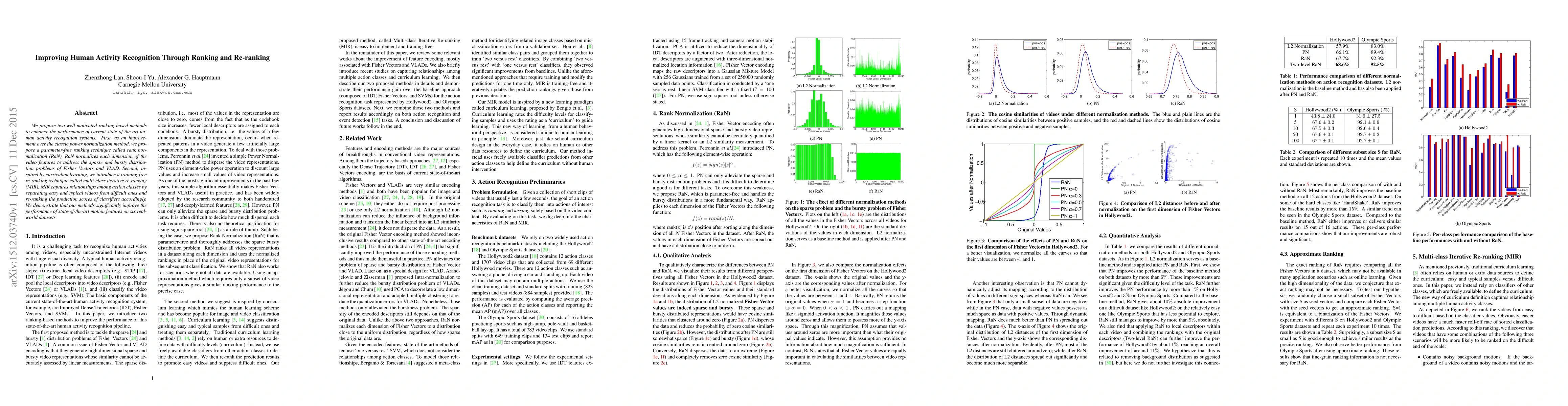 We propose two well-motivated ranking-based methods to enhance the performance of current state-of-the-art human activity recognition systems. First, as an improvement over the classic power normalization method, we propose a parameter-free ranking technique called rank normalization (RaN). RaN normalizes each dimension of the video features to address the sparse and bursty distribution problems of Fisher Vectors and VLAD. Second, inspired by curriculum learning, we introduce a training-free re-ranking technique called multi-class iterative re-ranking (MIR). MIR captures relationships among action classes by separating easy and typical videos from difficult ones and re-ranking the prediction scores of classifiers accordingly. We demonstrate that our methods significantly improve the performance of state-of-the-art motion features on six real-world datasets.