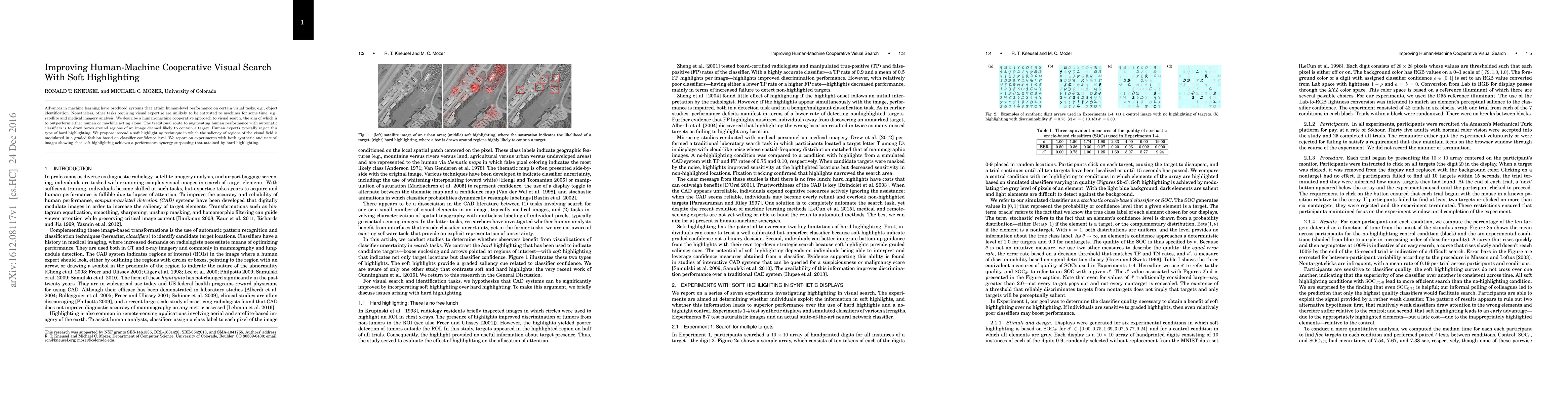 Advances in machine learning have produced systems that attain human-level performance on certain visual tasks, e.g., object identification. Nonetheless, other tasks requiring visual expertise are unlikely to be entrusted to machines for some time, e.g., satellite and medical imagery analysis. We describe a human-machine cooperative approach to visual search, the aim of which is to outperform either human or machine acting alone. The traditional route to augmenting human performance with automatic classifiers is to draw boxes around regions of an image deemed likely to contain a target. Human experts typically reject this type of hard highlighting. We propose instead a soft highlighting technique in which the saliency of regions of the visual field is modulated in a graded fashion based on classifier confidence level. We report on experiments with both synthetic and natural images showing that soft highlighting achieves a performance synergy surpassing that attained by hard highlighting.
