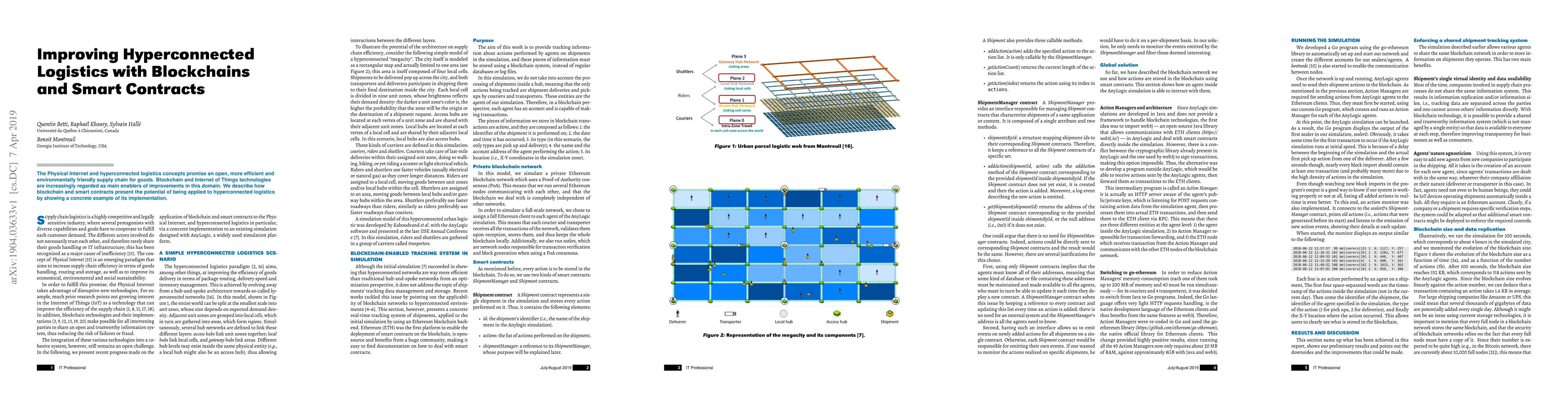 The Physical Internet and hyperconnected logistics concepts promise an open, more efficient and environmentally friendly supply chain for goods. Blockchain and Internet of Things technologies are increasingly regarded as main enablers of improvements in this domain. We describe how blockchain and smart contracts present the potential of being applied to hyperconnected logistics by showing a concrete example of its implementation.