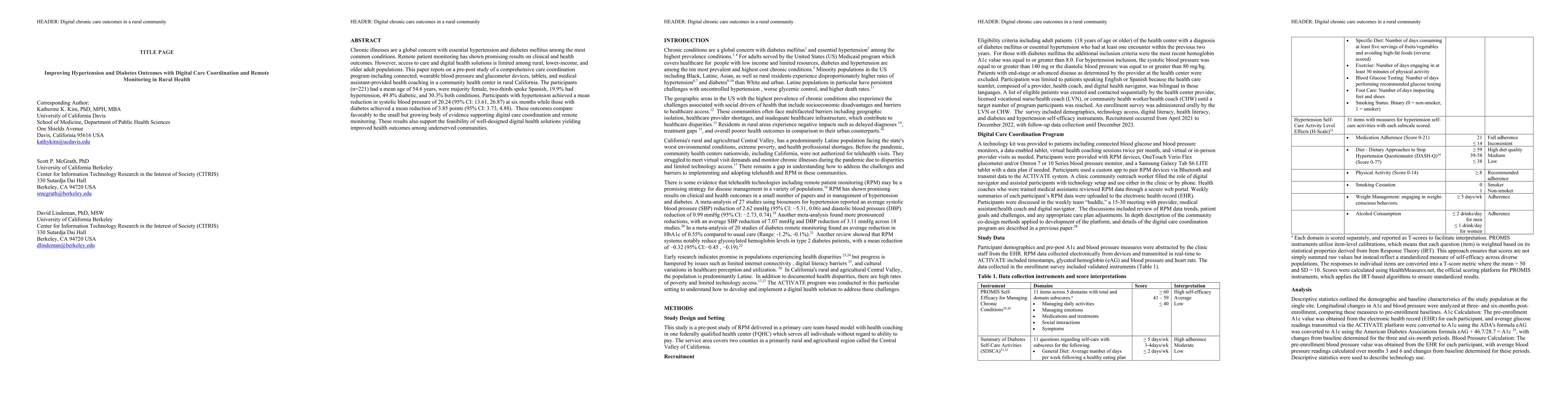 Chronic illnesses are a global concern with essential hypertension and diabetes mellitus among the most common conditions. Remote patient monitoring has shown promising results on clinical and health outcomes. However, access to care and digital health solutions is limited among rural, lower-income, and older adult populations. This paper repots on a pre-post study of a comprehensive care coordination program including connected, wearable blood pressure and glucometer devices, tablets, and medical assistant-provided health coaching in a community health center in rural California. The participants (n=221) had a mean age of 54.6 years, were majority female, two-thirds spoke Spanish, 19.9% had hypertension, 49.8% diabetic, and 30.3% both conditions. Participants with hypertension achieved a mean reduction in systolic blood pressure of 20.24 (95% CI: 13.61, 26.87) at six months while those with diabetes achieved a mean reduction of 3.85 points (95% CI: 3.73, 4.88). These outcomes compare favorably to the small but growing body of evidence supporting digital care coordination and remote monitoring. These results also support the feasibility of well-designed digital health solutions yielding improved health outcomes among underserved communities.